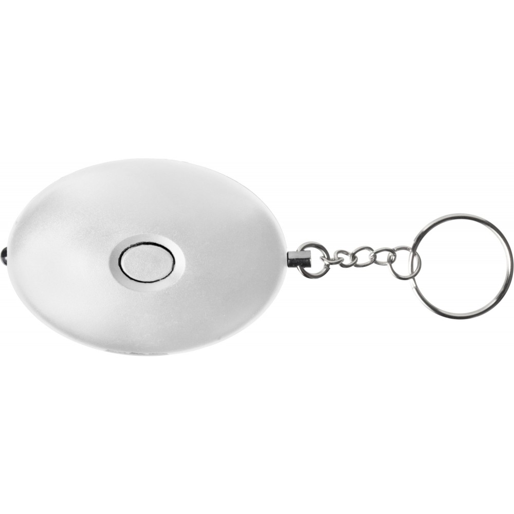 Riasztó kulcstartóval. A LED-lámpa és a riasztó hangja gombbal indítható el. Az elemet tartalmazza. 102 dB-lel szól. ABS műanyag. Emblémázás: Tamponnyomás