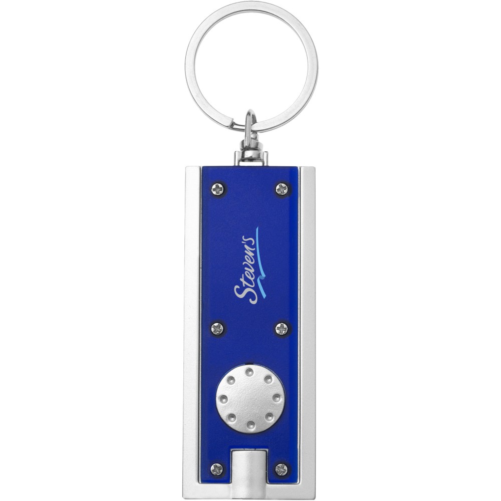 Fehér LED-es kulcstartó. Tartozék elemmel. Fém. Emblémázás: Tamponnyomás, UV nyomtatás