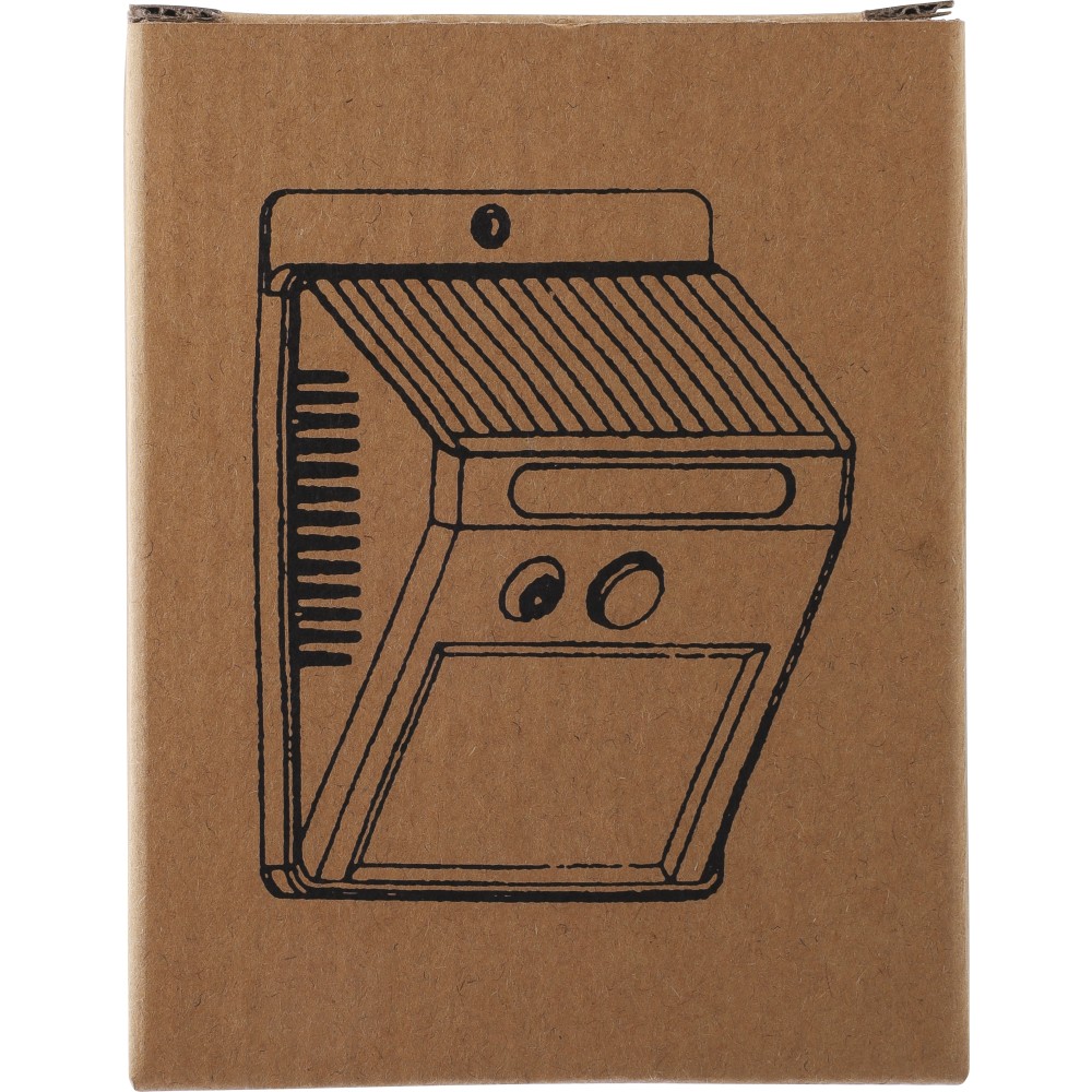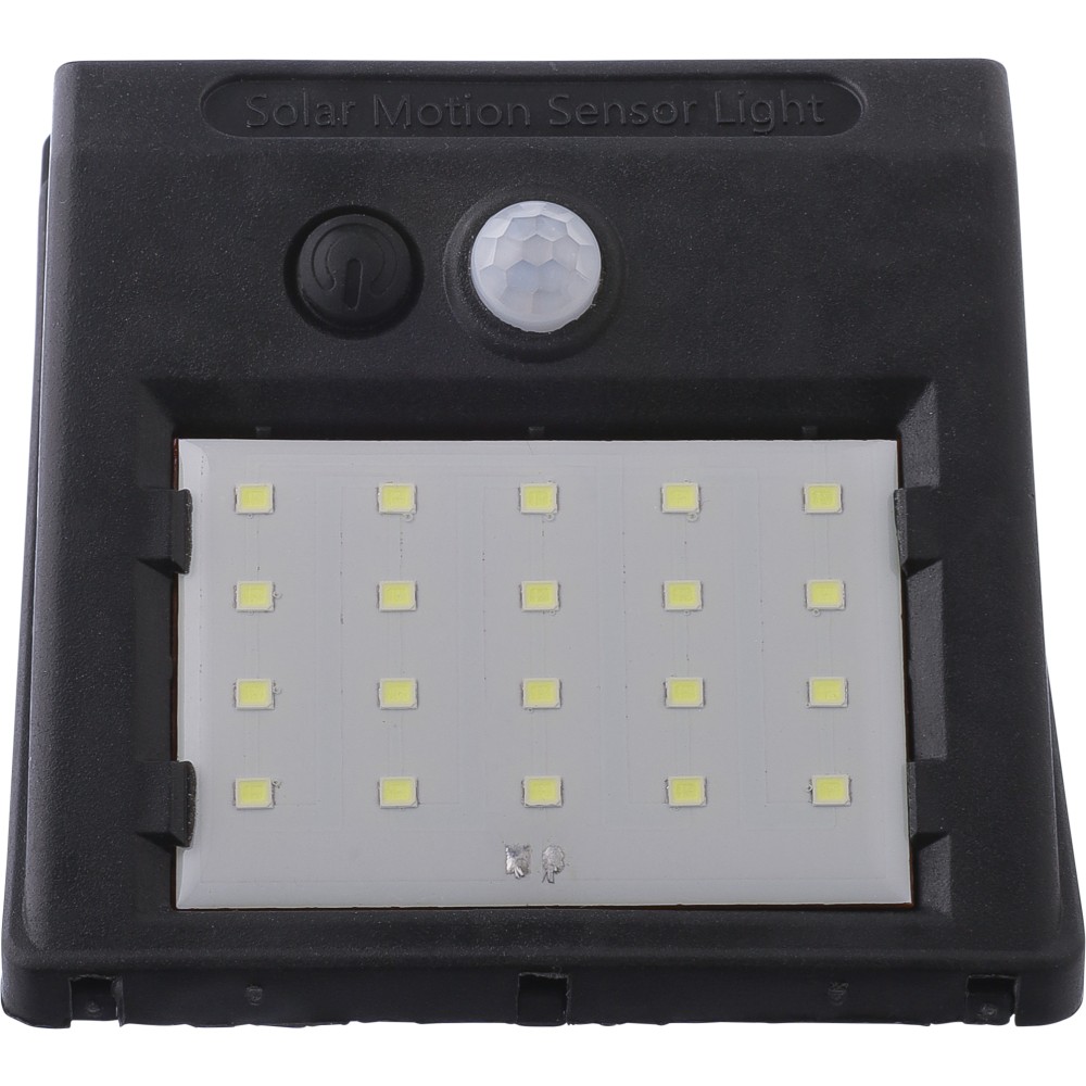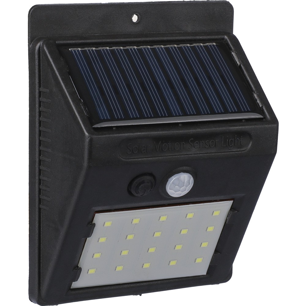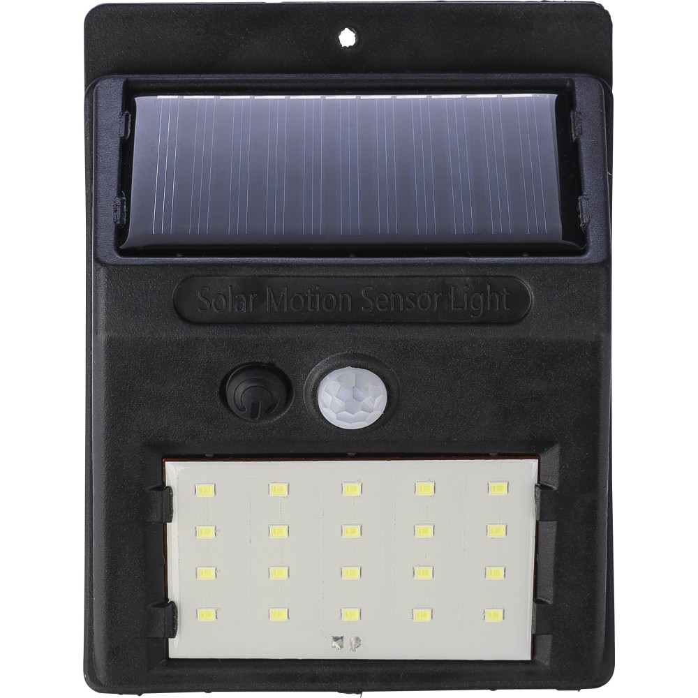 Napelemes lámpa 20 COB LED-del. Éjjeli érzékelővel (CDS) és mozgásérzékelővel (PIR). 800 mAh-s akkumulátorral, töltőkábellel, IP44 besorolással és állandó vagy villogó funkciókkal. Csomagolása barna papírdoboz. PP. Emblémázás: Tamponnyomás