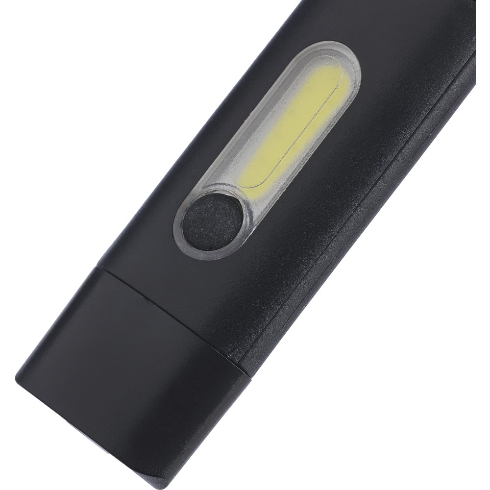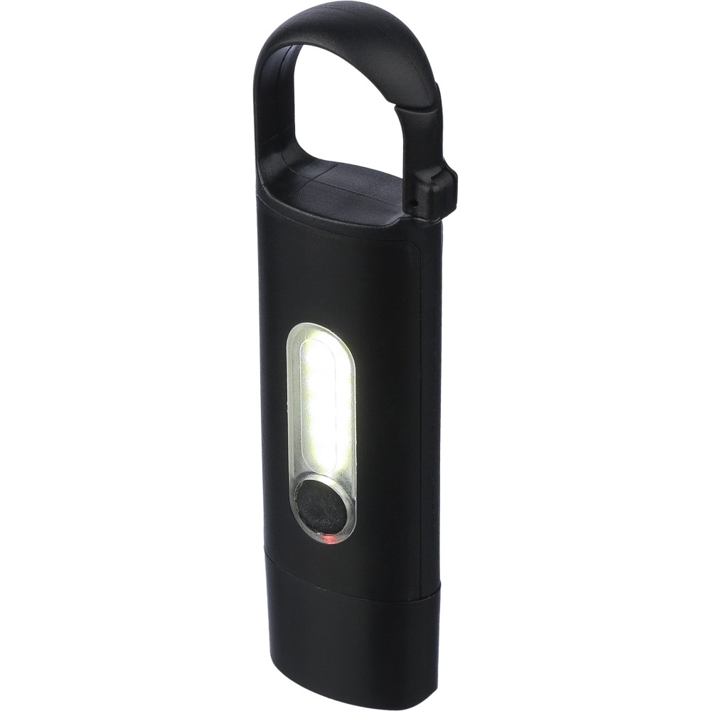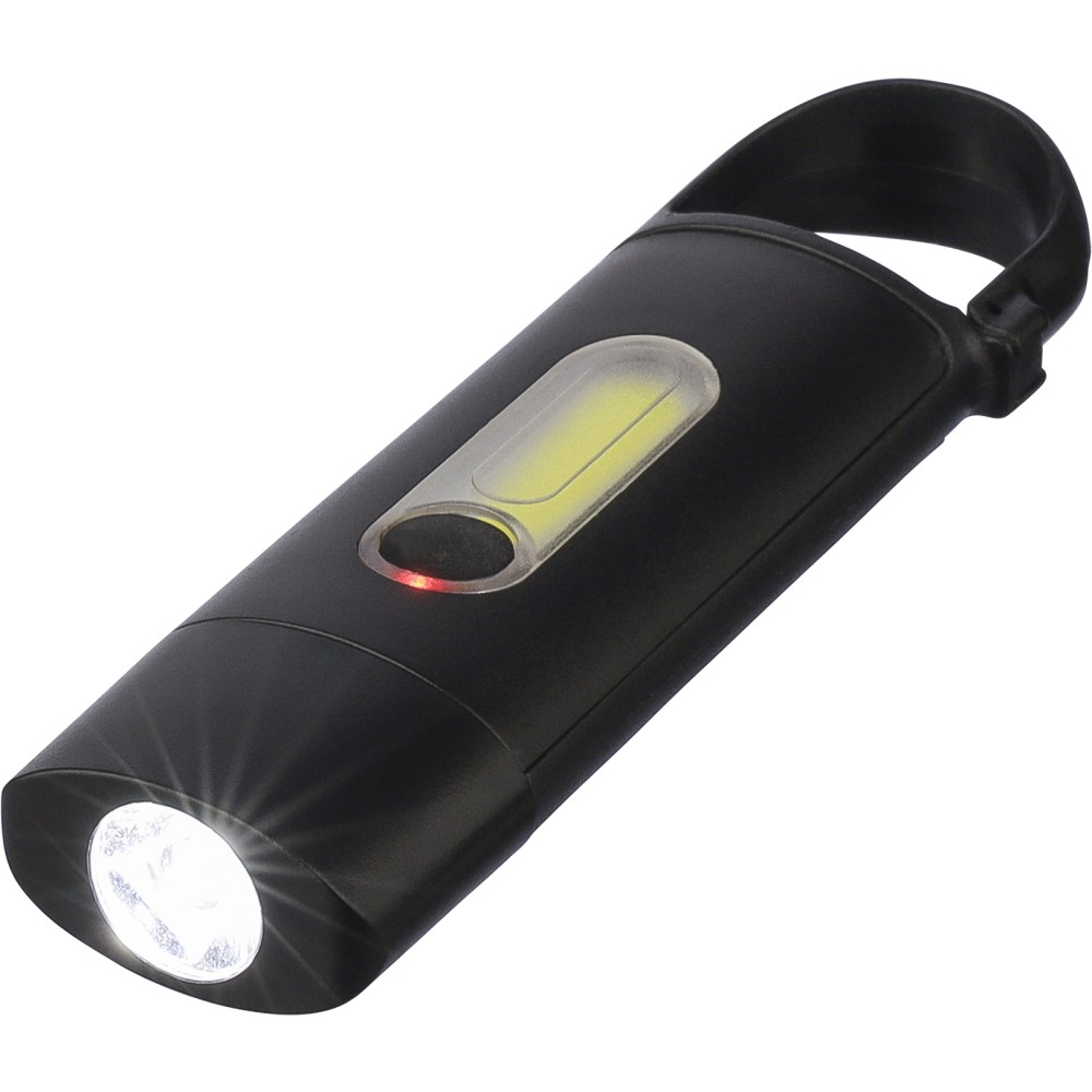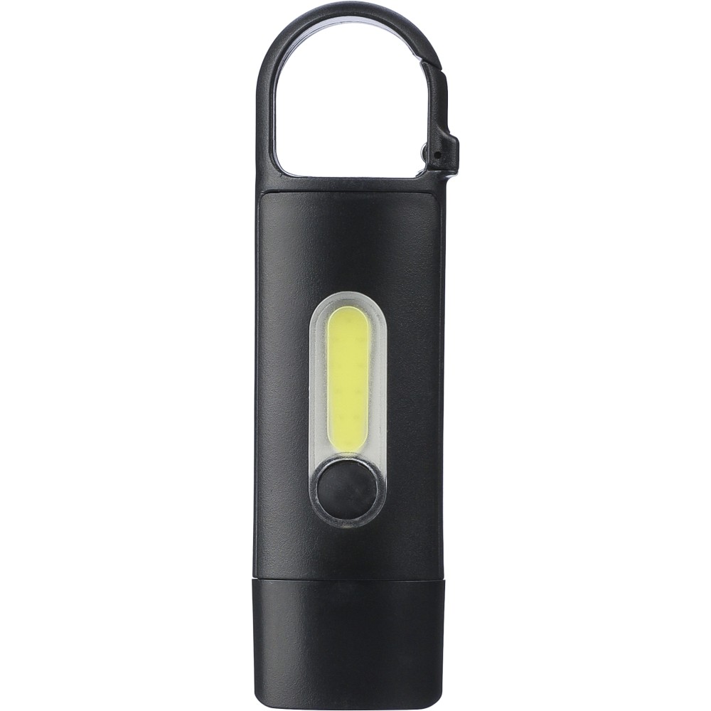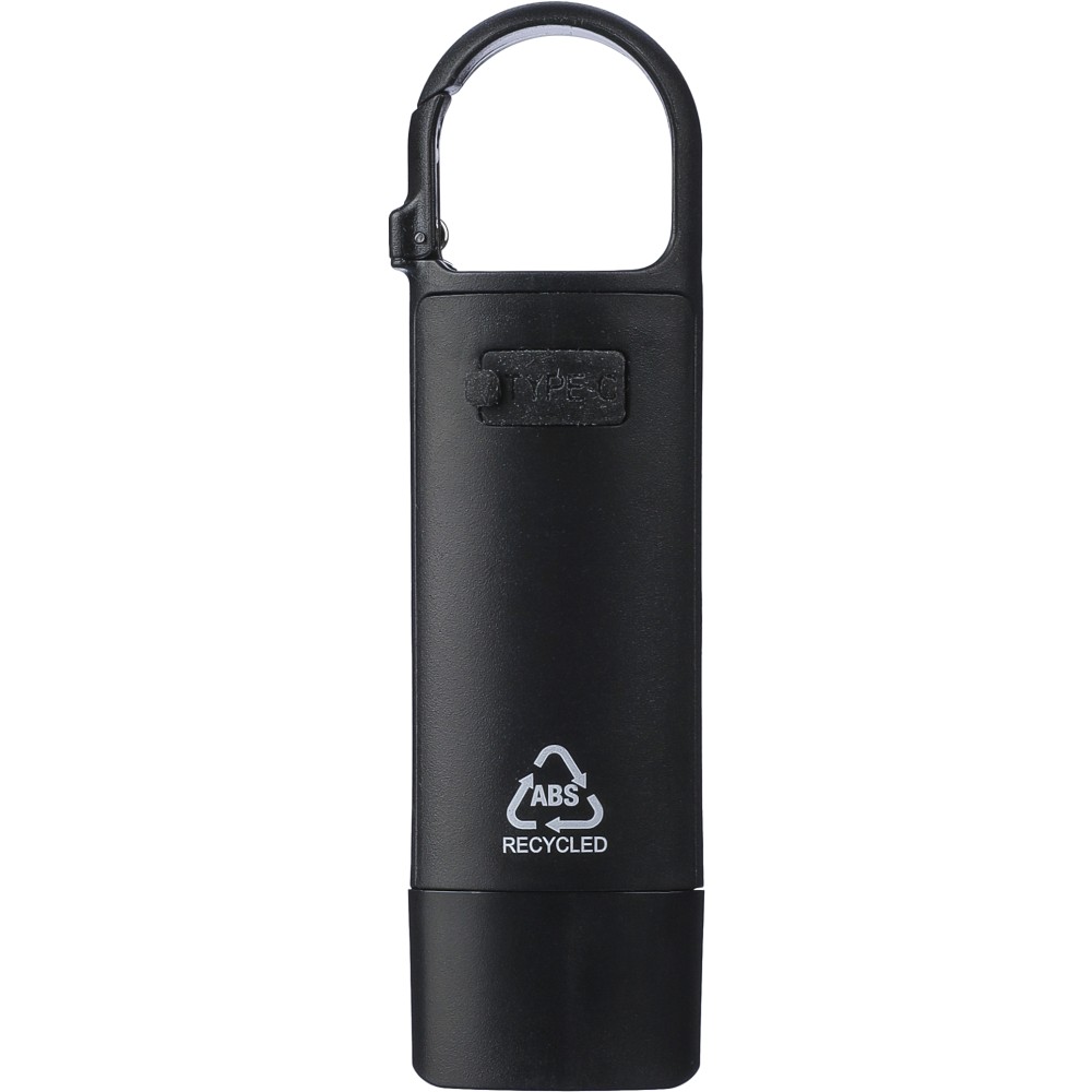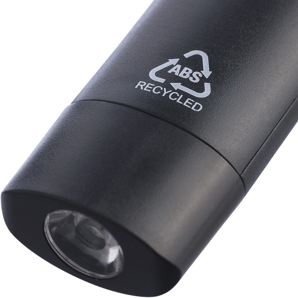 Mini elemlámpa újrahasznosított ABS anyagból, beépített 20 mAh-s, usb-n keresztül tölthető akkumulátorral és karabinerrel. Első COB lámpával és oldalsó COB fényszóróval, mely három világítási móddal rendelkezik. USB-C töltőkábellel, újrahasznosított ABS anyagot jelző logóval. Csomagolása barna papírdoboz. Emblémázás: Tamponnyomás