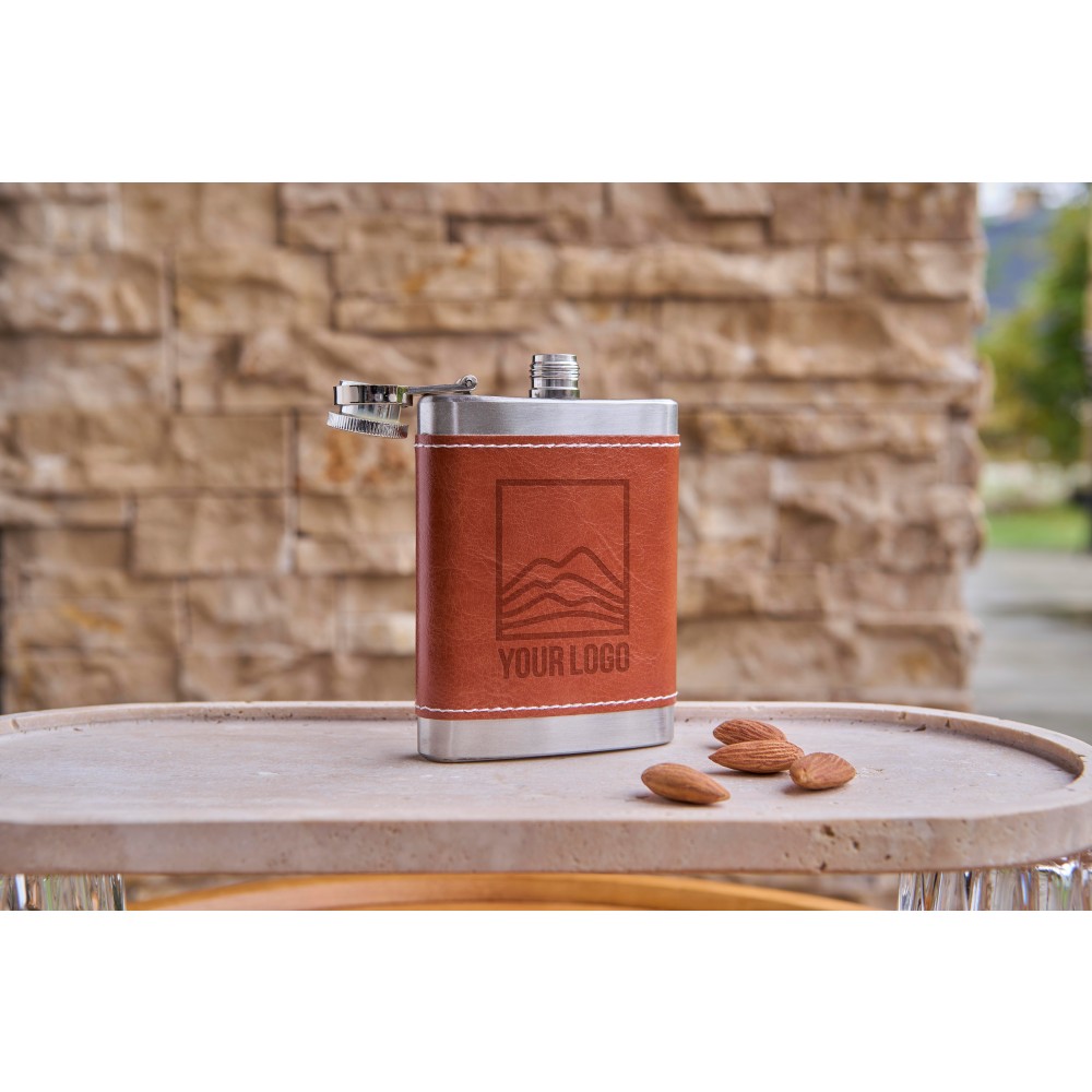 Laposüveg PU borítással. 304-es rozsdamentes acélból készült. Egyenként barna kartondobozba csomagolva. Űrtartalom: 100 ml. Emblémázás: Tamponnyomás