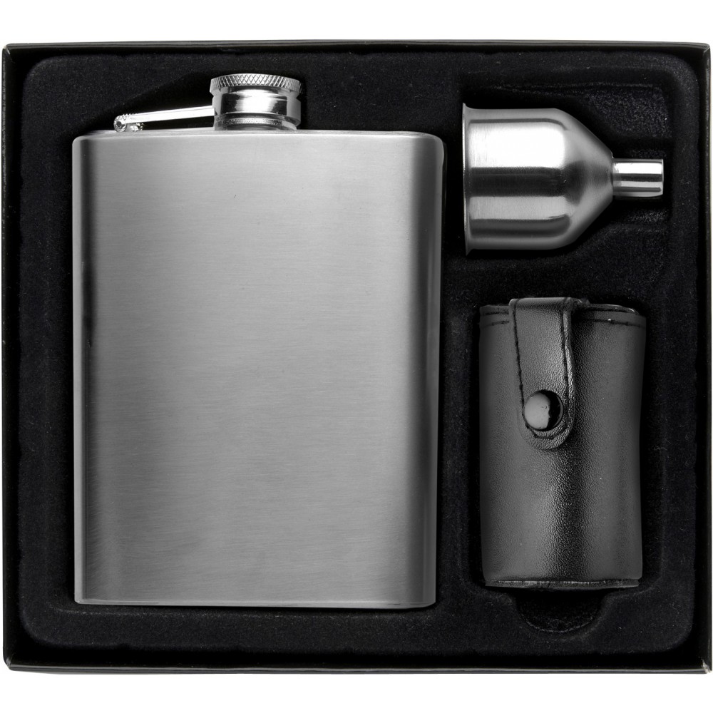 Laposüveg 4 db kupicával. A laposüveg 210 ml-es, a kupicák 30 ml-esek. Nem szivárgásmentes. Mosogatógépben nem tisztítható. Emblémázás: Gravírozás, Tamponnyomás
