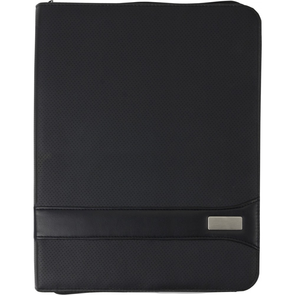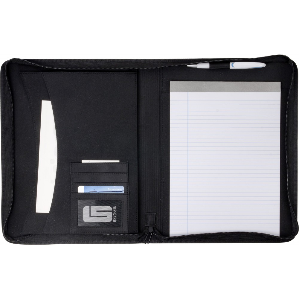 A4-es cipzáras PVC mappa két nagy belső zsebbel, négy kisebb, névjegykártya méretű zsebbel, tollhurokkal és 30 lapos, vonalas jegyzettömbbel. Emblémázás: Gravírozás, Tamponnyomás
