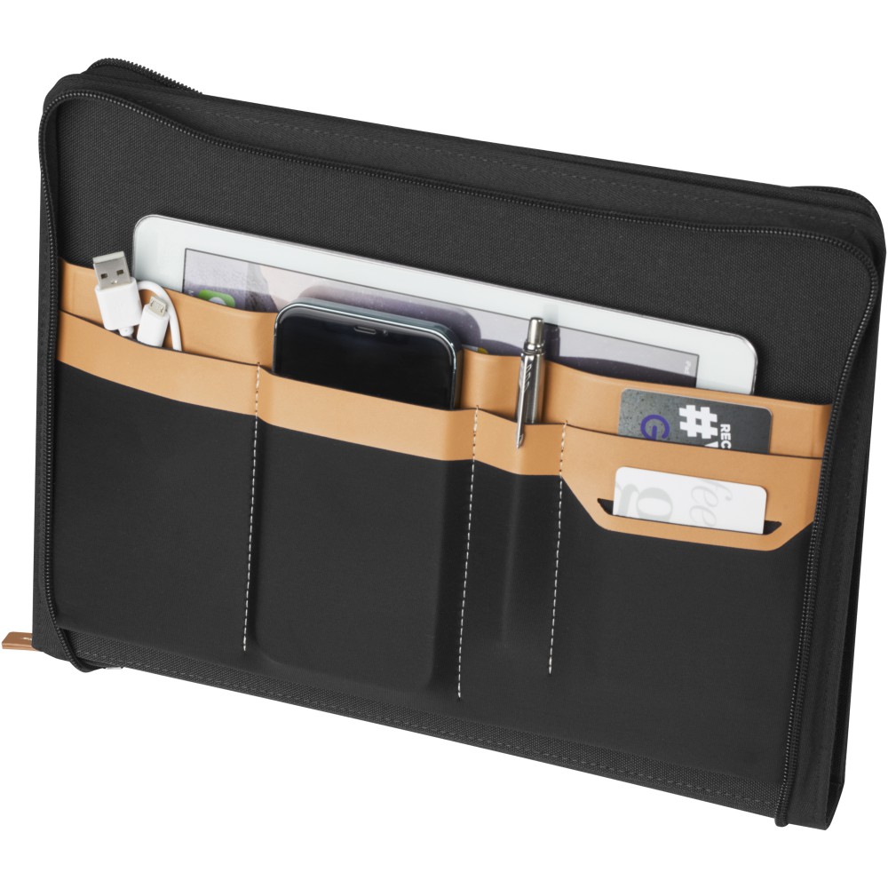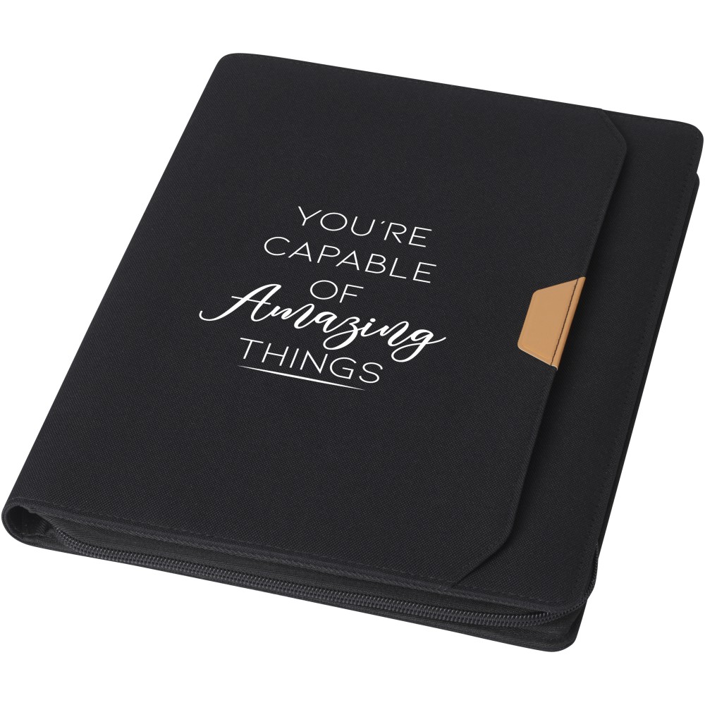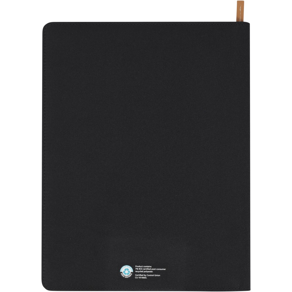 Az RCS tanúsítvánnyal rendelkező Nomumi portfólió részben újrahasznosított poliészterből készül, így ez a portfólió fenntarthatóbb választás, mivel segít csökkenteni az új nyersanyag felhasználást. Cipzáras záródással, tollhurokkal, harmonikazsebbel és 20 fehér vonalas lappal rendelkezik, amelyek 70 g/m2 -es, fenntartható forrásból származó, újrahasznosított papírból készültek. A képeken látható toll és egyéb kiegészítők nem tartoznak a termékhez. Emblémázás: Tamponnyomás
