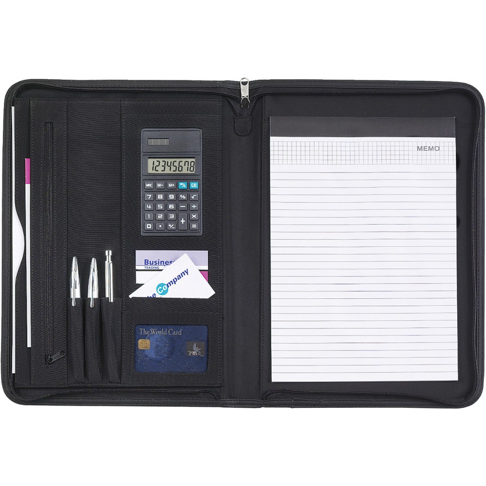 A4-es cipzáras mappa 8 karakteres számológéppel , jegyzettömbbel. Napelemmel és elemmel is működik. Mikroszálas anyagból. Emblémázás: Gravírozás, Szitanyomás, Tamponnyomás