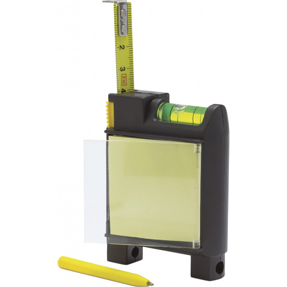 Övre csiptethető mérőszalag, vízszintmérővel, jegyzettömbbel. 2 m-es. Emblémázás: Tamponnyomás