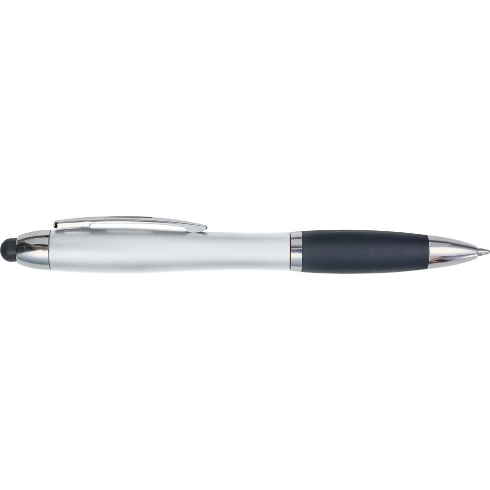 Golyóstoll lámpával, fekete gumis fogórésszel, krómozott kiegészítőkkel, kék tollbetéttel. A lézergravírozott logó világít a lámpának köszönhetően. ABS műanyag. Emblémázás: Gravírozás