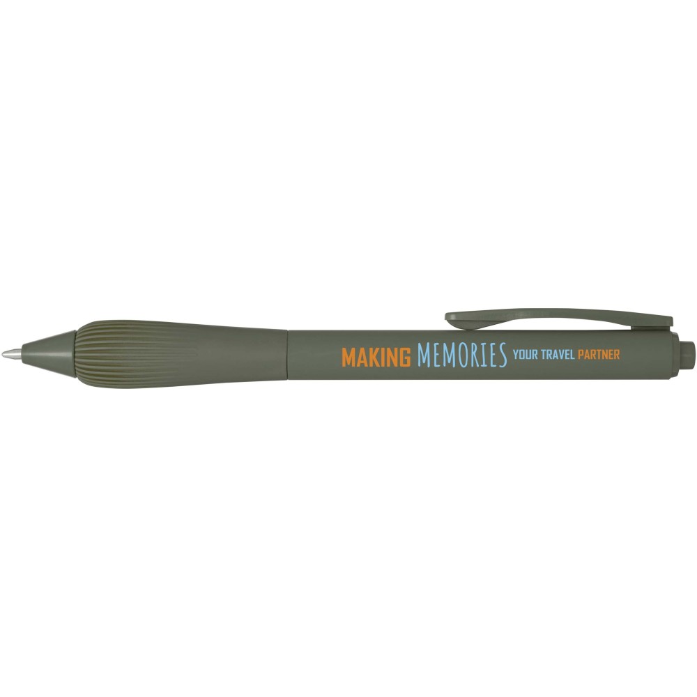 Újrahasznosított műanyag golyóstoll gumírozott tolltesttel és TPR anyagból készült fogórésszel. Fekete tollbetéttel. Írási hossz: 1000 méter. Hegyméret: 1,0 mm. Emblémázás: Tamponnyomás