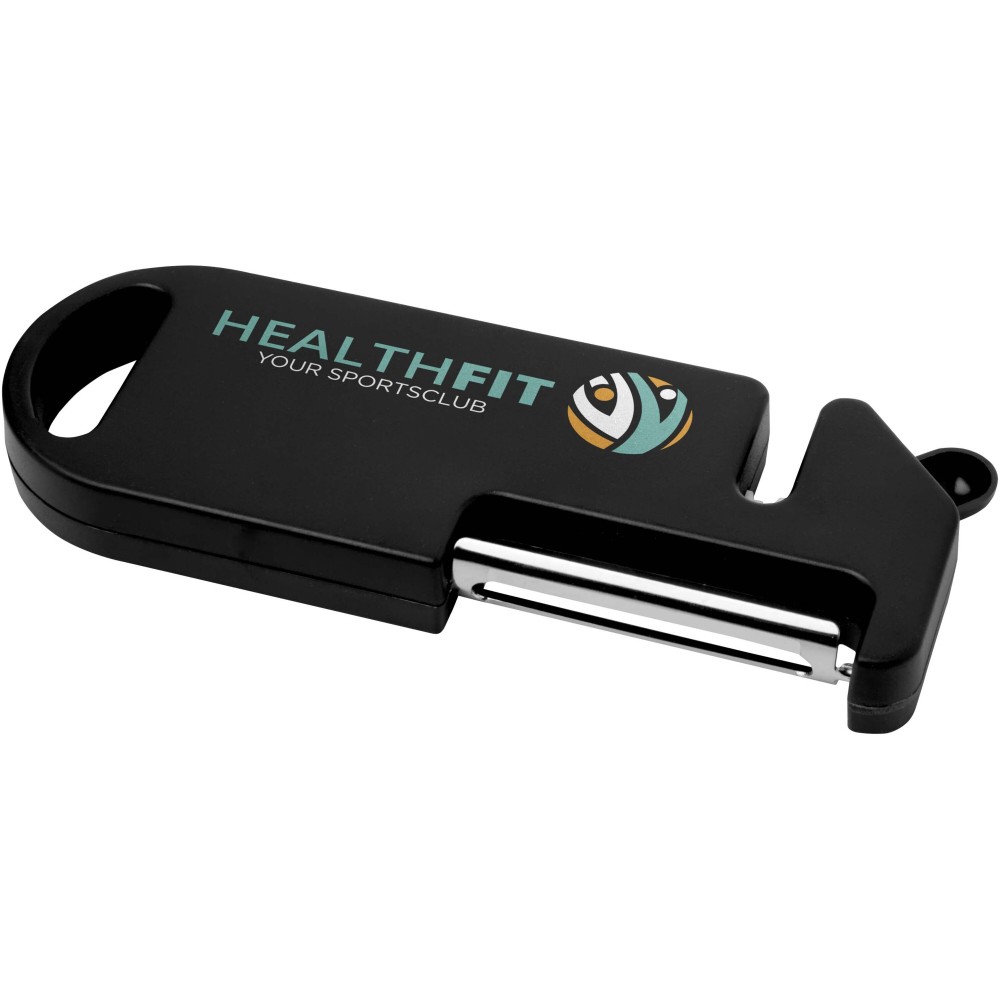 Ez a sokoldalú konyhai eszköz négy alapvető funkciót egyesít egy kompakt kialakításban. Újrahasznosított műanyagból készült, és tartalmaz hámozót, sörnyitót, késélezőt, valamint hegyes véget a burgonya foltjainak eltávolításához. Akasztójának köszönhetően könnyen tárolható. Praktikus és helytakarékos megoldás, amely nélkülözhetetlen minden szakács számára. Emblémázás: Matricázás, Tamponnyomás, UV nyomtatás