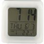 Kocka alakú ébresztőóra változó színű fénnyel. Funkciói: óra, naptár, hőmérő. Az elemet tartalmazza. HIPS műanyag. Emblémázás: Tamponnyomás, UV nyomtatás
