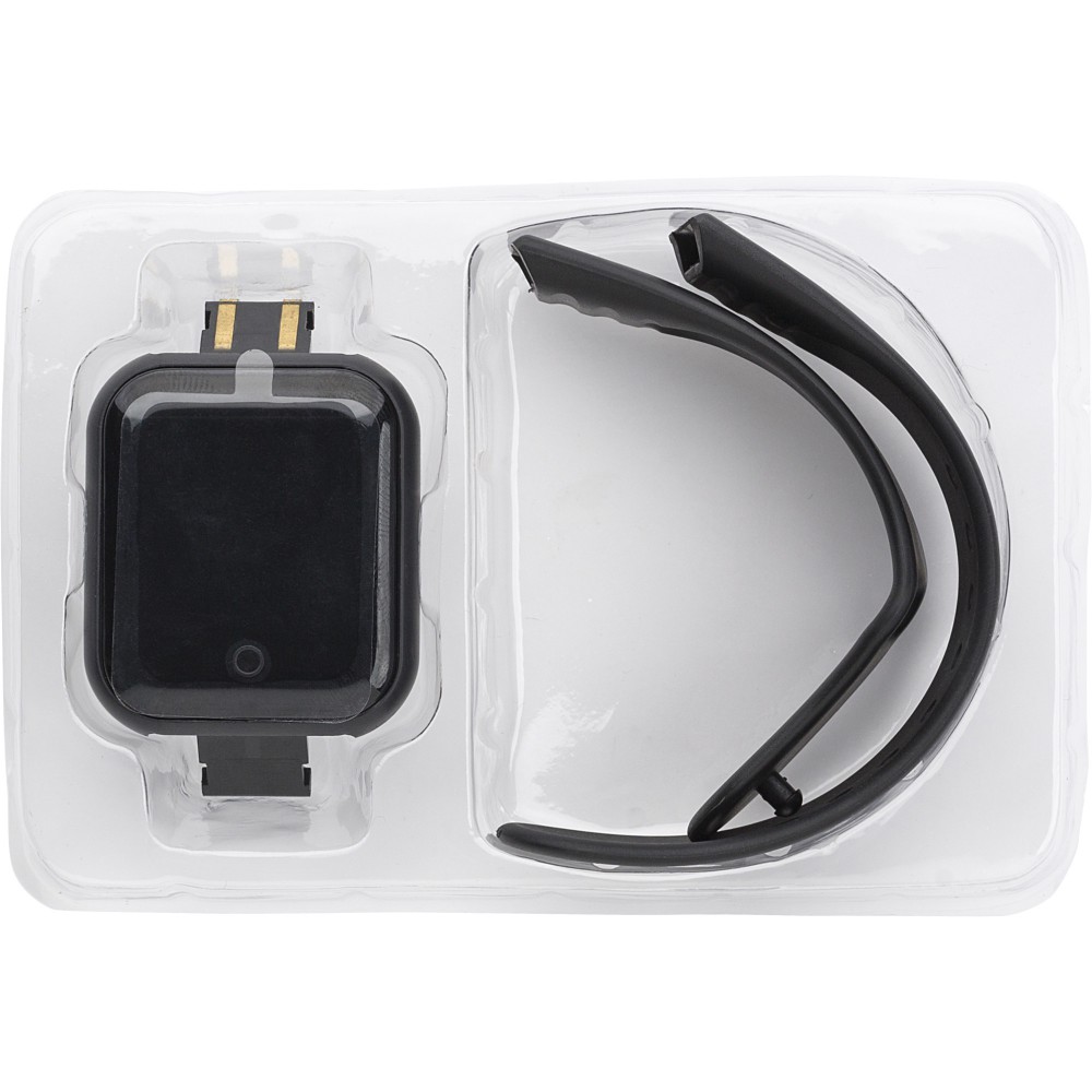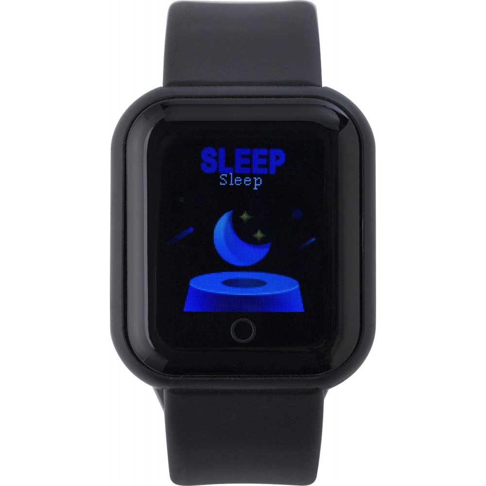 PET és PVC okosóra állítható karpánttal és vezeték nélküli technológiával. Funkciók: szívritmus, alvásfigyelő, oxigénmérés, üzenet emlékeztető, ivóvíz emlékeztető, edzés emlékeztető. USB töltő a csuklópántba rejtve. Emblémázás: Tamponnyomás