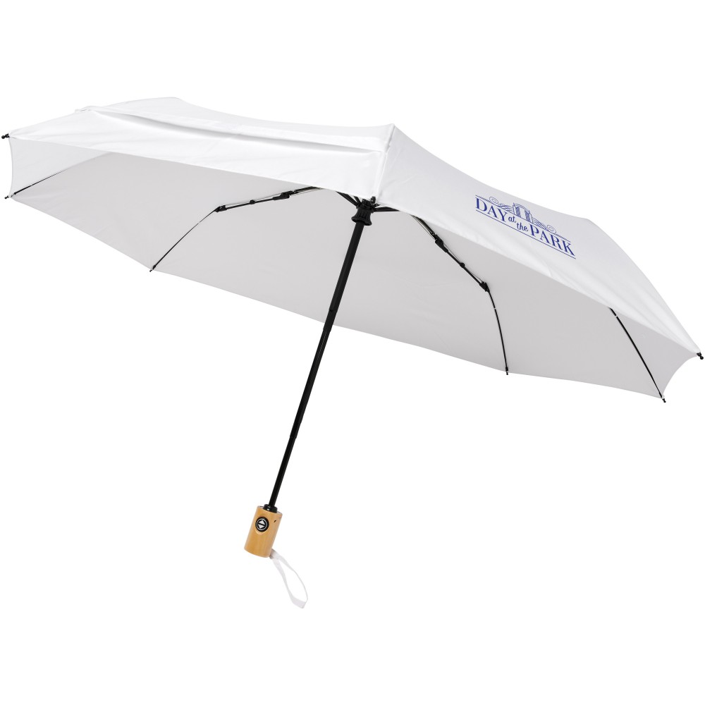 Összecsukható 21 -es esernyő. Erős fém váz, üvegszálas szerkezet. Fa nyele és az újrahasznosított RPET alapanyag miatt jó választás azok számára, akiknek fontos a fenntartható szemlélet. Emblémázás: Szitanyomás