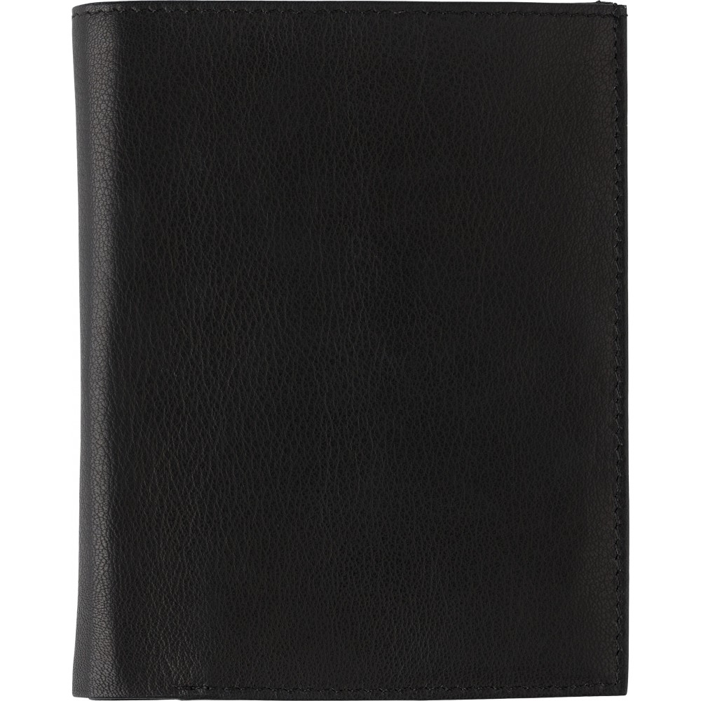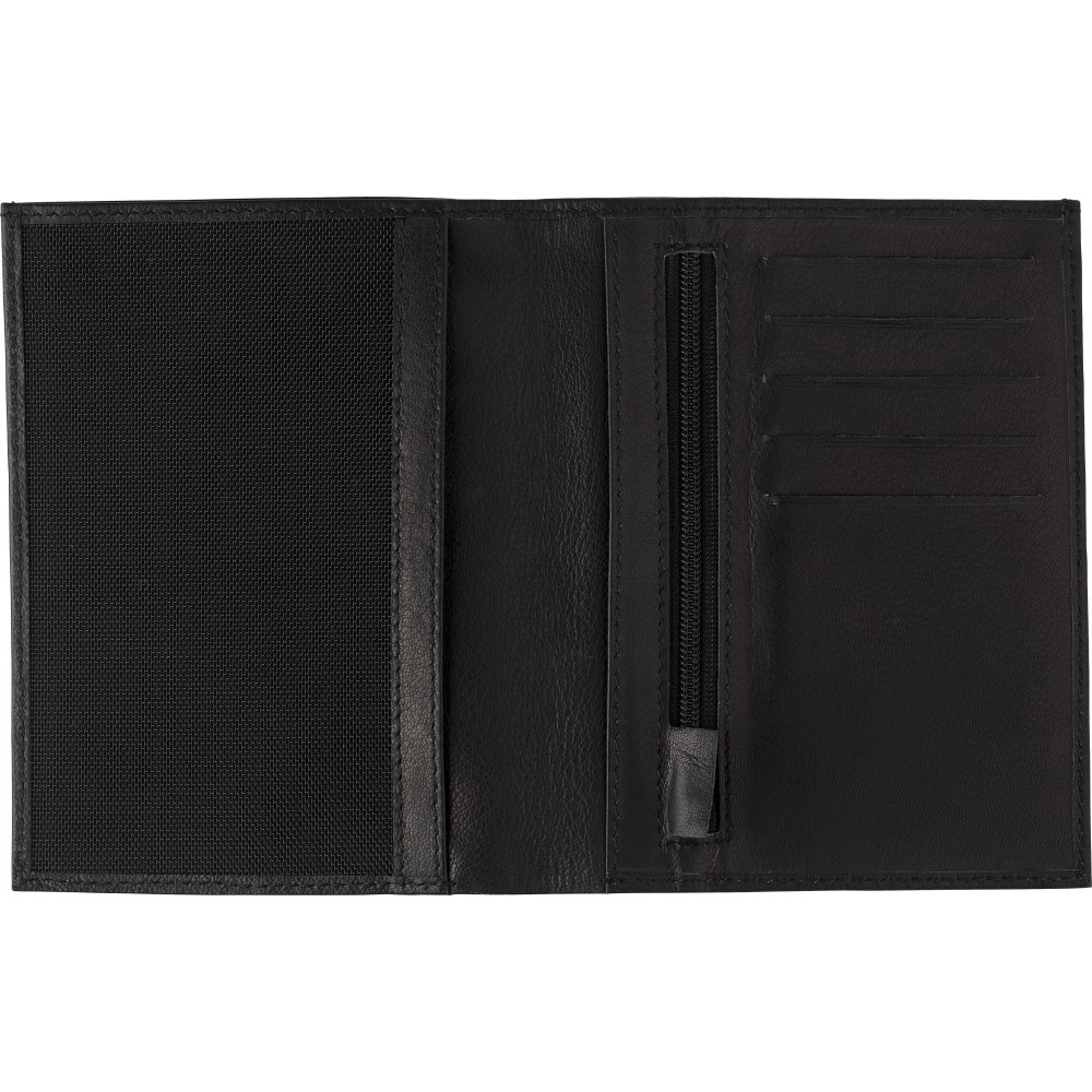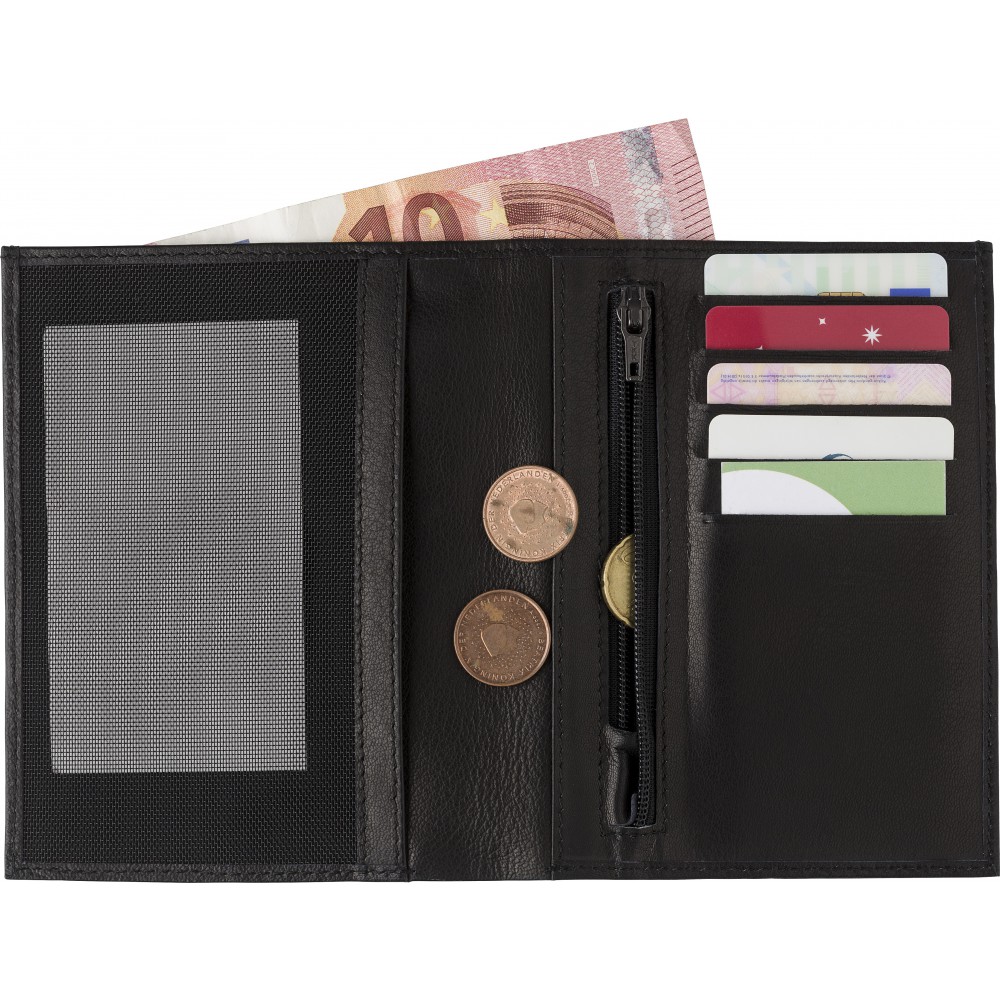 Hasított bőr kártyatartó RFID védelemmel az adatlopás ellen, cipzáros érmetartóval és több zsebbel a papírpénz és kártyák számára. Emblémázás: Tamponnyomás