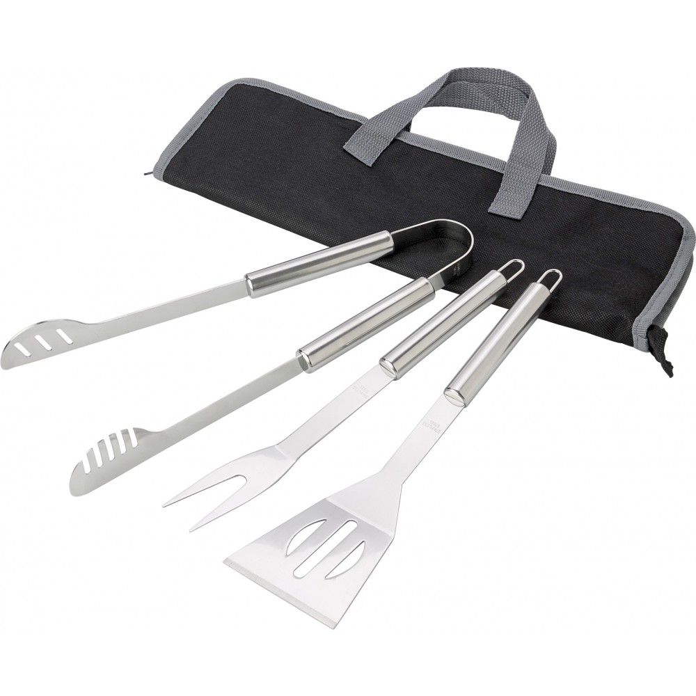 3 darabos BBQ készlet nemszőtt táskában. Húslapát, fogó és villa. Emblémázás: Gravírozás, Szitanyomás