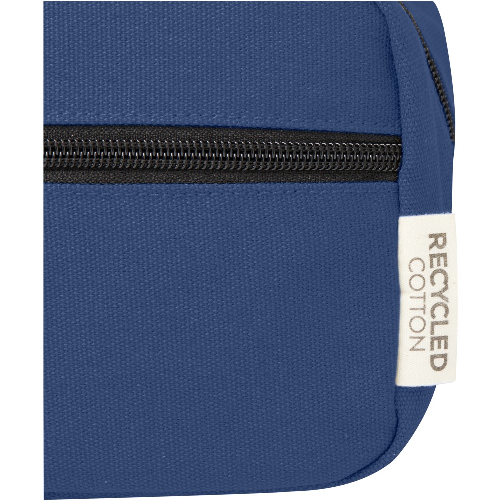 GRS tanúsítvánnyal rendelkező újrahasznosított vászonból és GRS tanúsítvánnyal rendelkező RPET béléssel készült piperetáska. Egy cipzáras elülső zsebbel és egy cipzáras főrekesszel, szervezőzsebekkel és pánttal rendelkezik. Fémlapja gravírozható. Űrtartalom: 3,5 liter. Emblémázás: Szitanyomás