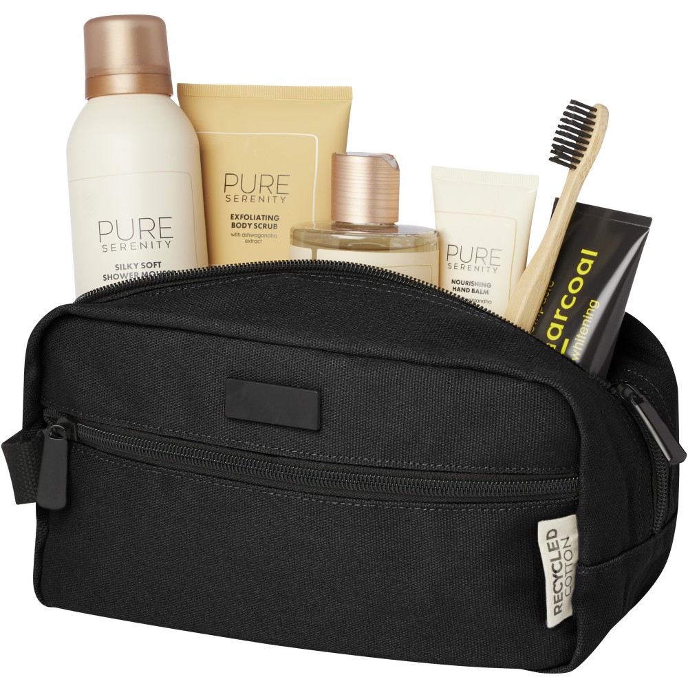 GRS tanúsítvánnyal rendelkező újrahasznosított vászonból és GRS tanúsítvánnyal rendelkező RPET béléssel készült piperetáska. Egy cipzáras elülső zsebbel és egy cipzáras főrekesszel, szervezőzsebekkel és pánttal rendelkezik. Fémlapja gravírozható. Űrtartalom: 3,5 liter. Emblémázás: Szitanyomás