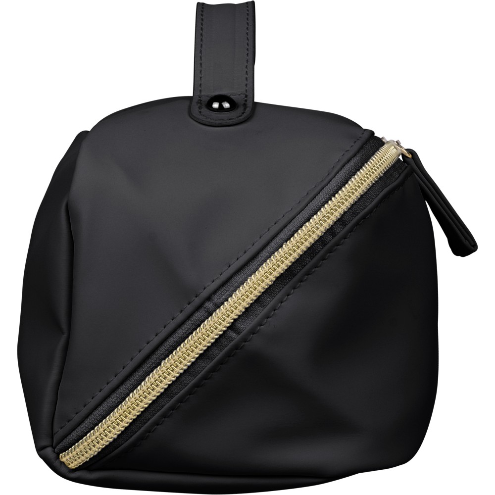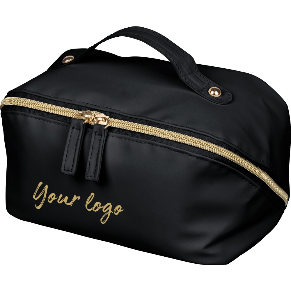 Újrahasznosított PU anyagból készült neszesszer középen elhelyezett cipzárral a széles nyithatóság érdekében. Rövid fogantyúval, tágas belső térrel és négy rekesszel, beleértve egy belső cipzáras zsebet. 210D újrahasznosított béléssel készült, belsejében egy újrahasznosított alapanyagra utaló címkével.