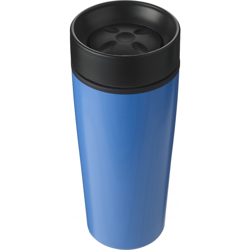 Rozsdamentes acél duplafalú bögre műanyag betéttel, fehér ajándékdobozban. Nem szivárgásmentes. Mosogatógépben nem tisztítható. 450 ml. Emblémázás: Gravírozás, Körszita, Tamponnyomás