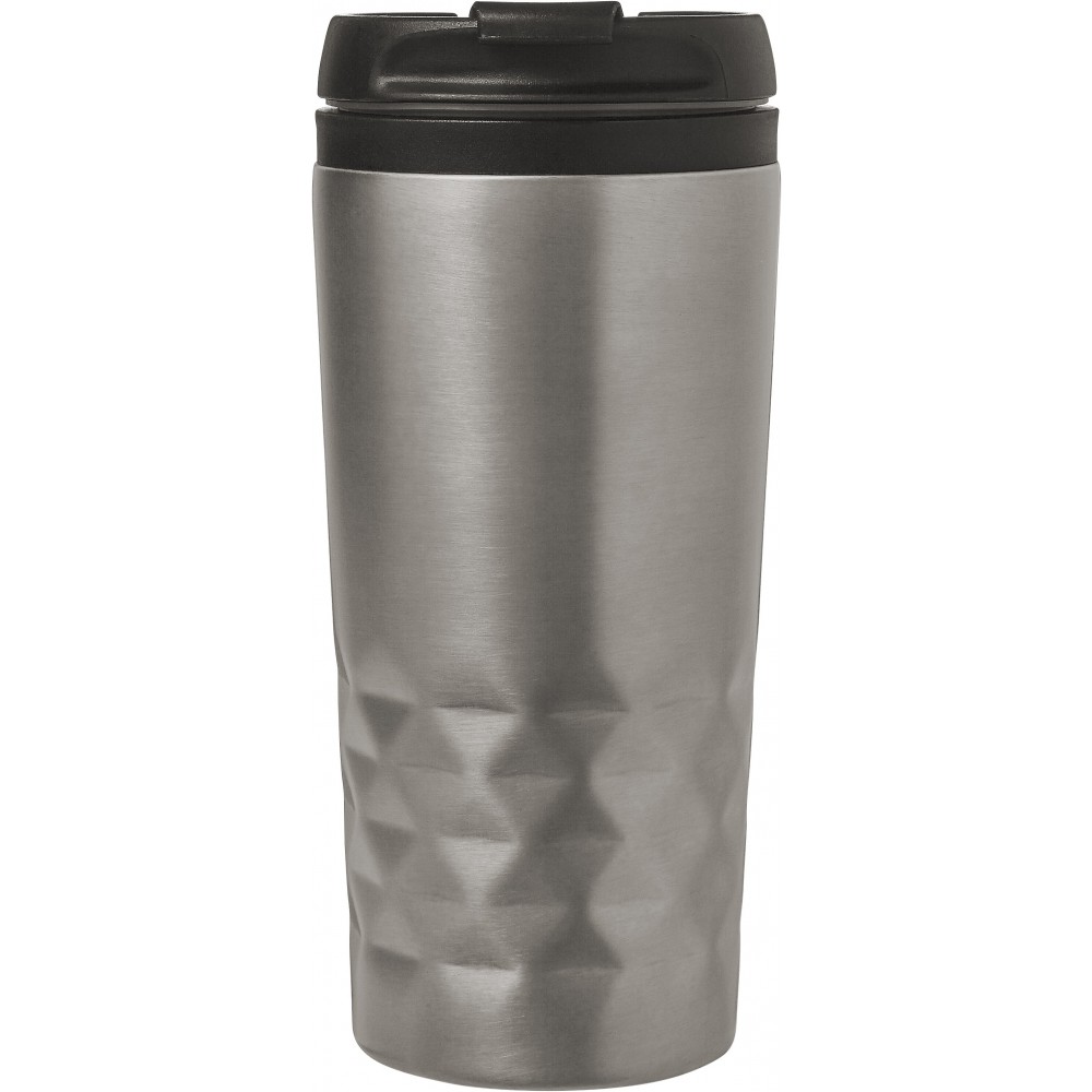 Duplafalú fedeles pohár. 300 ml. Rozsdamentes acél és BPA-mentes műanyag. Nem szivárgásmentes és nem mosogatógépálló termék. Emblémázás: Gravírozás, Körszita, Tamponnyomás