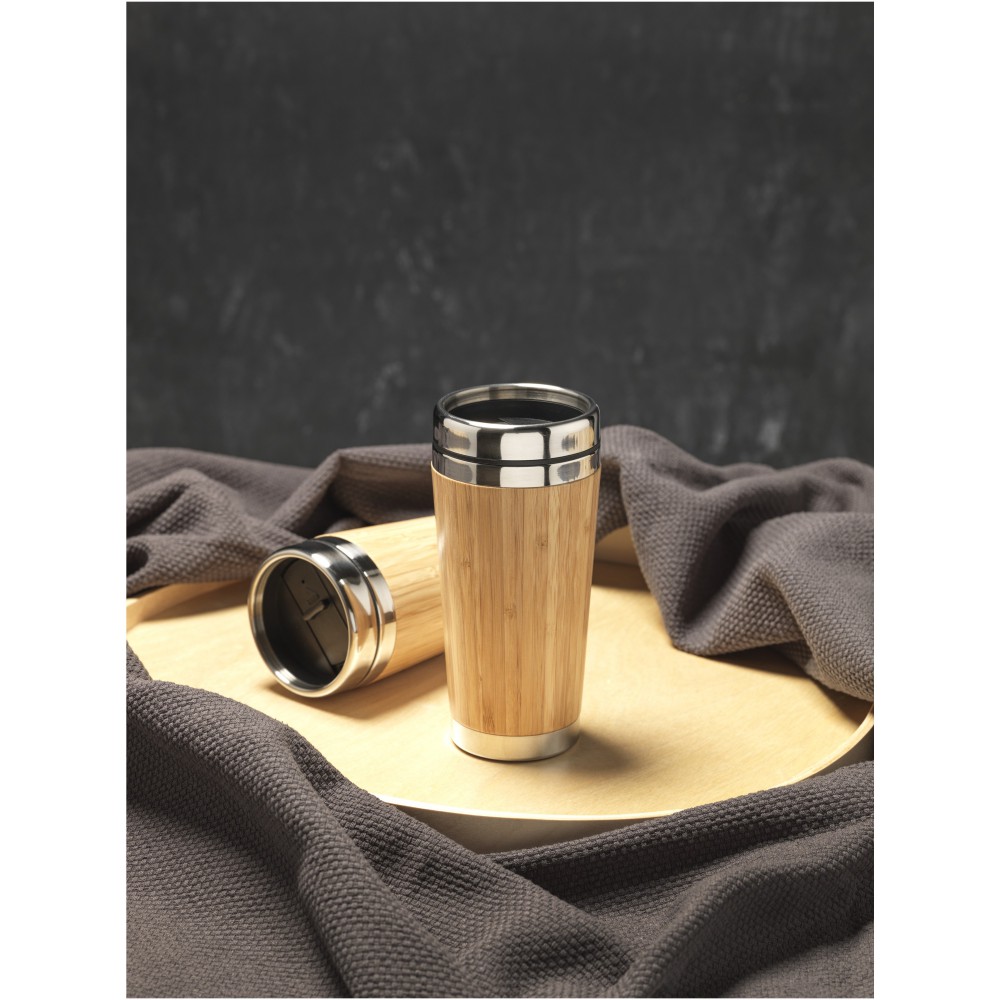 Duplafalú szigetelt pohár rozsdamentes acélból és természetes külső bambuszfelülettel. Melegtartó képesség: 2 óra, a hűtött italok hidegen tartására 4 órán át alkalmas. Nem szivárgásmentes. Szénsavas italokkal nem használható. Mosogatógépben nem mosható és mikrohullámú sütőben történő melegítésre nem alkalmas. Emblémázás: Gravírozás, Tamponnyomás