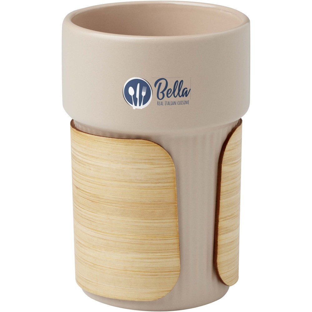 A stílusos Fiko kerámia pohár levehető bambusz burkolattal rendelkezik, amely ideális forró italok fogyasztásához. A bambusz fenntartható, környezetbarát és társadalmilag felelős forrásból származik. Űrtartalom: 340 ml. Újrahasznosított kartondobozban szállítjuk. Emblémázás: Gravírozás, Tamponnyomás