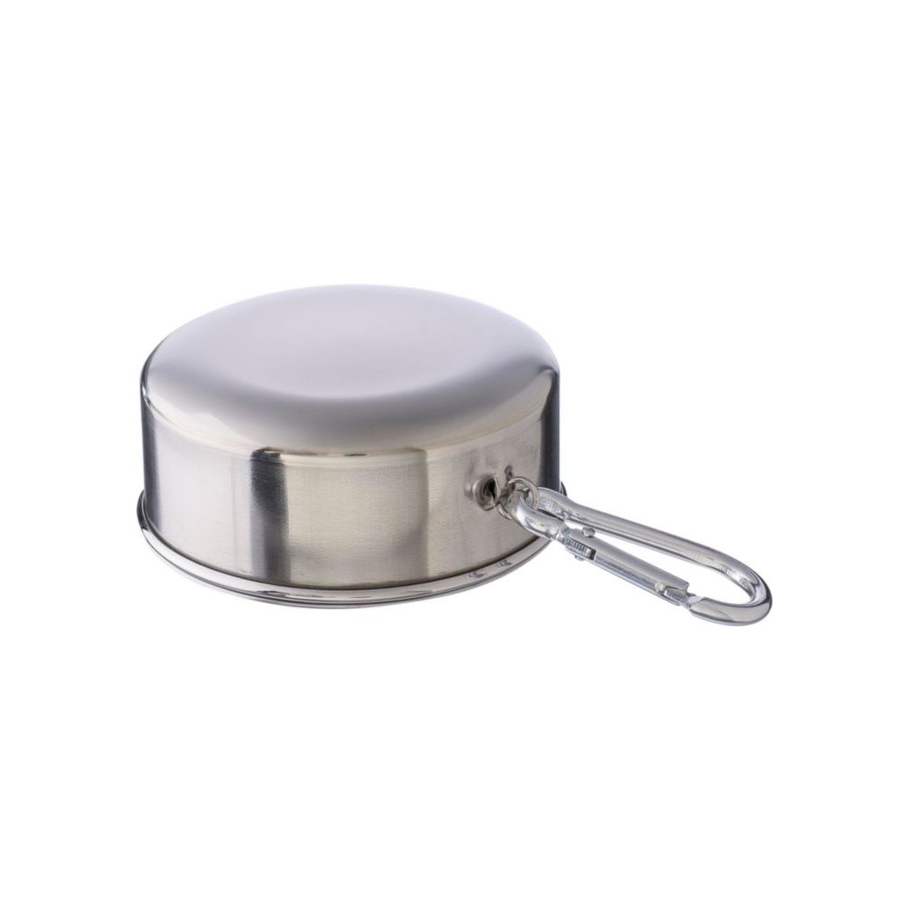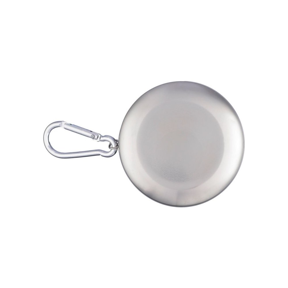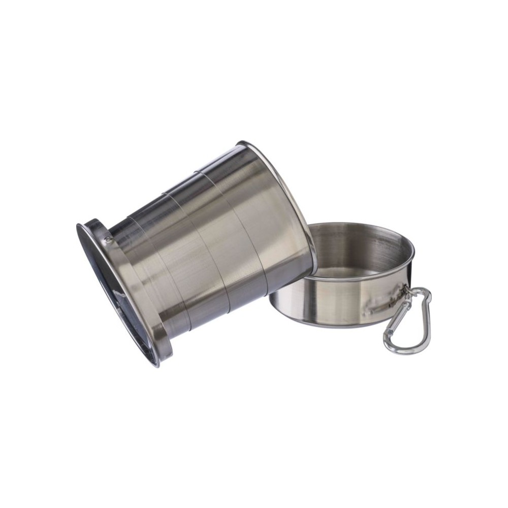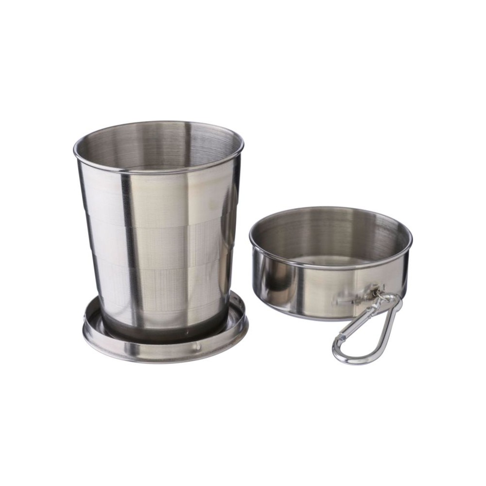 Összecsukható pohár fém karabinerrel. Egyenként barna kartondobozba csomagolva. Anyaga: rozsdamentes acél. Űrtartalom: 220 ml. Emblémázás: Gravírozás