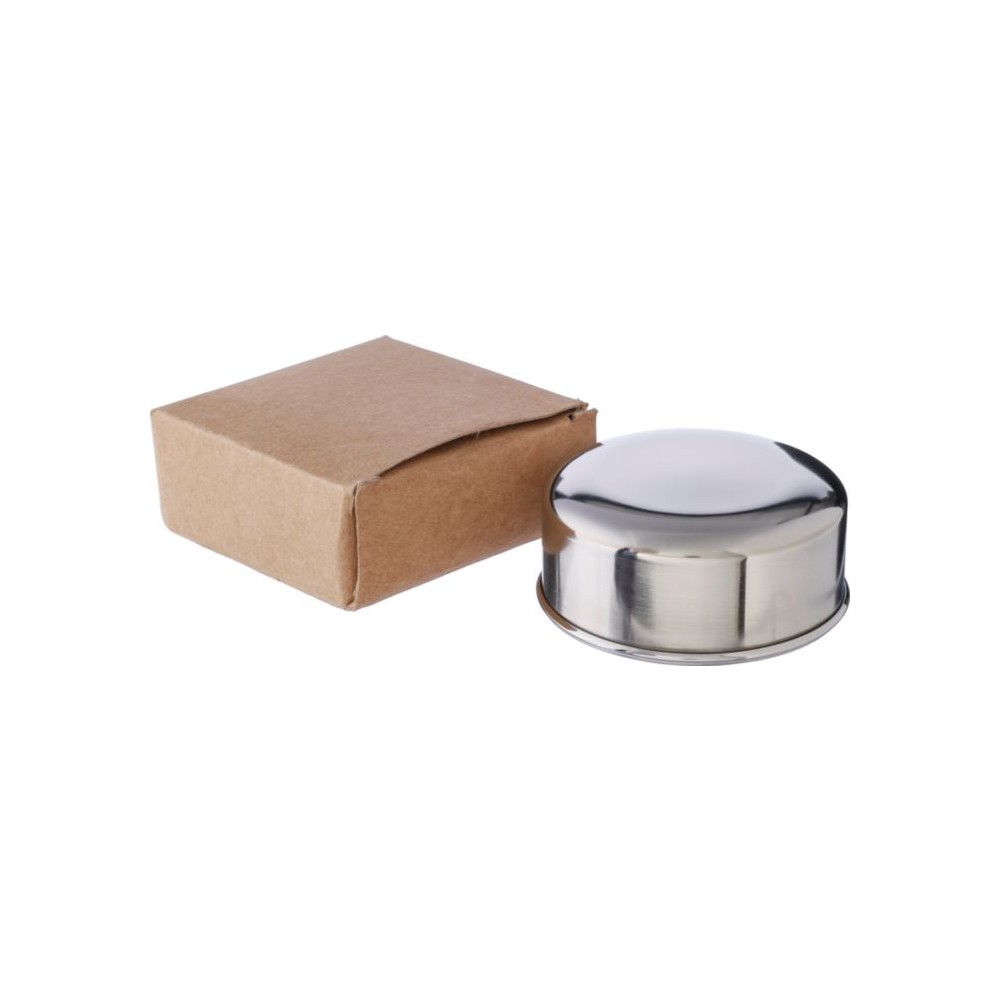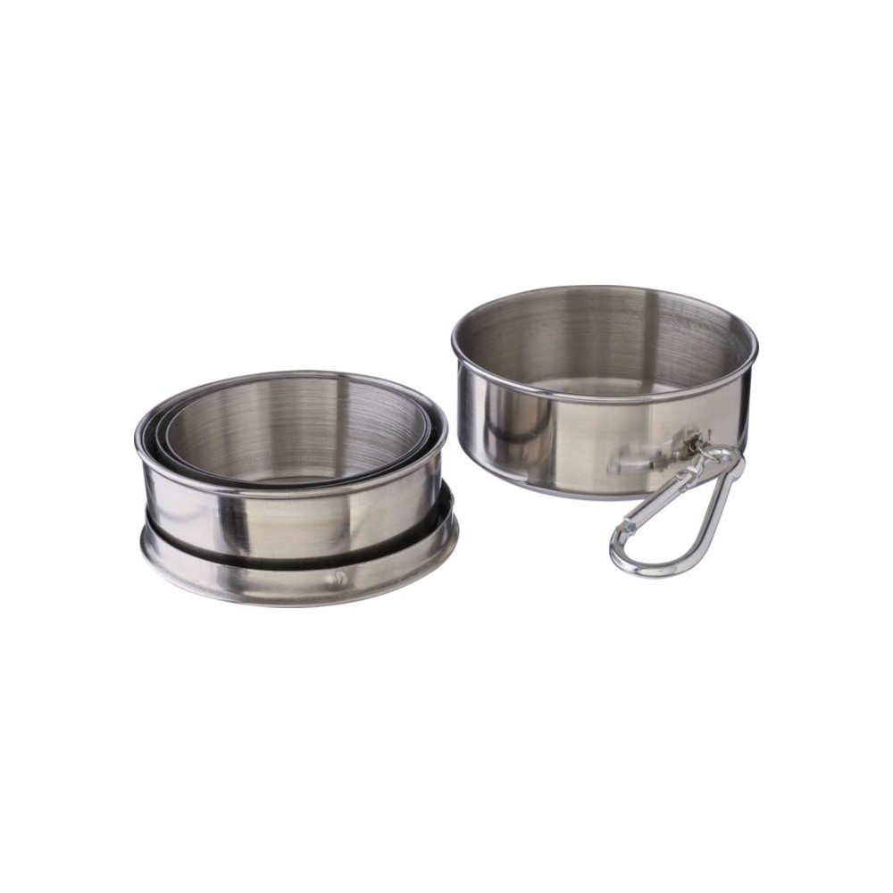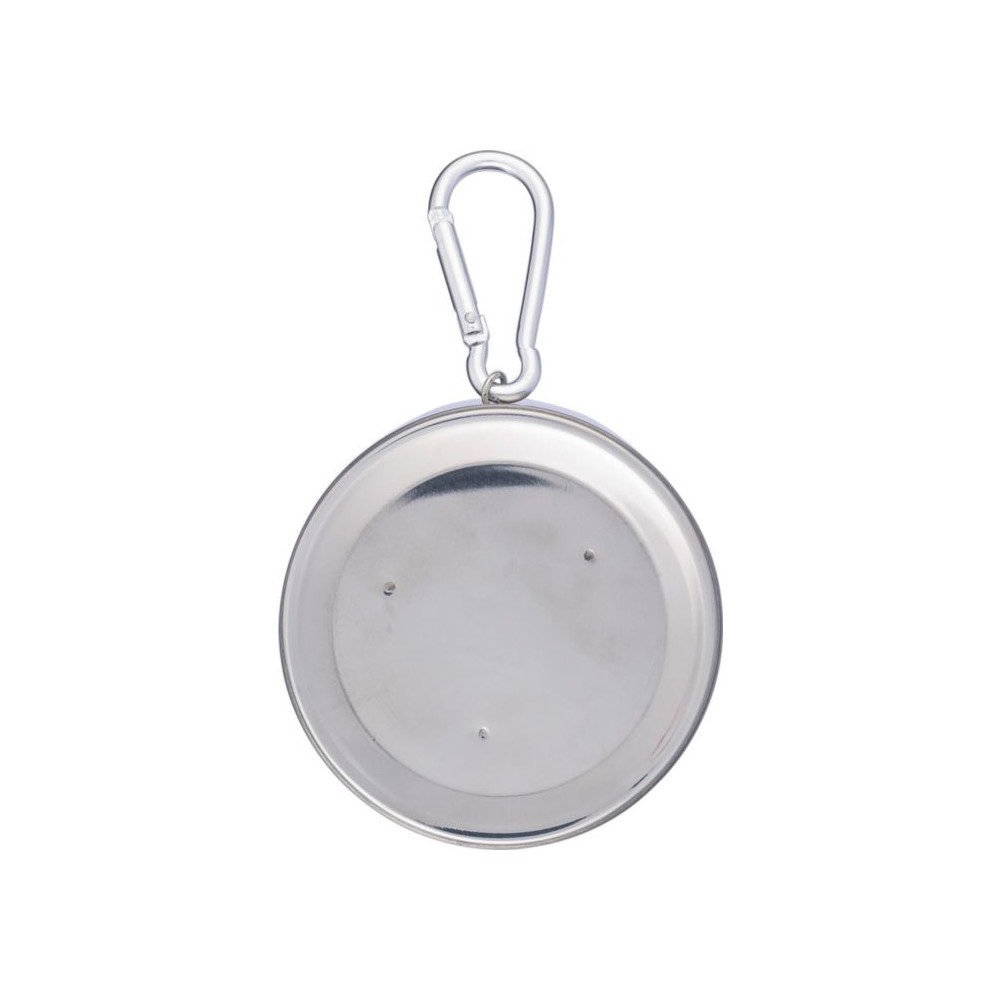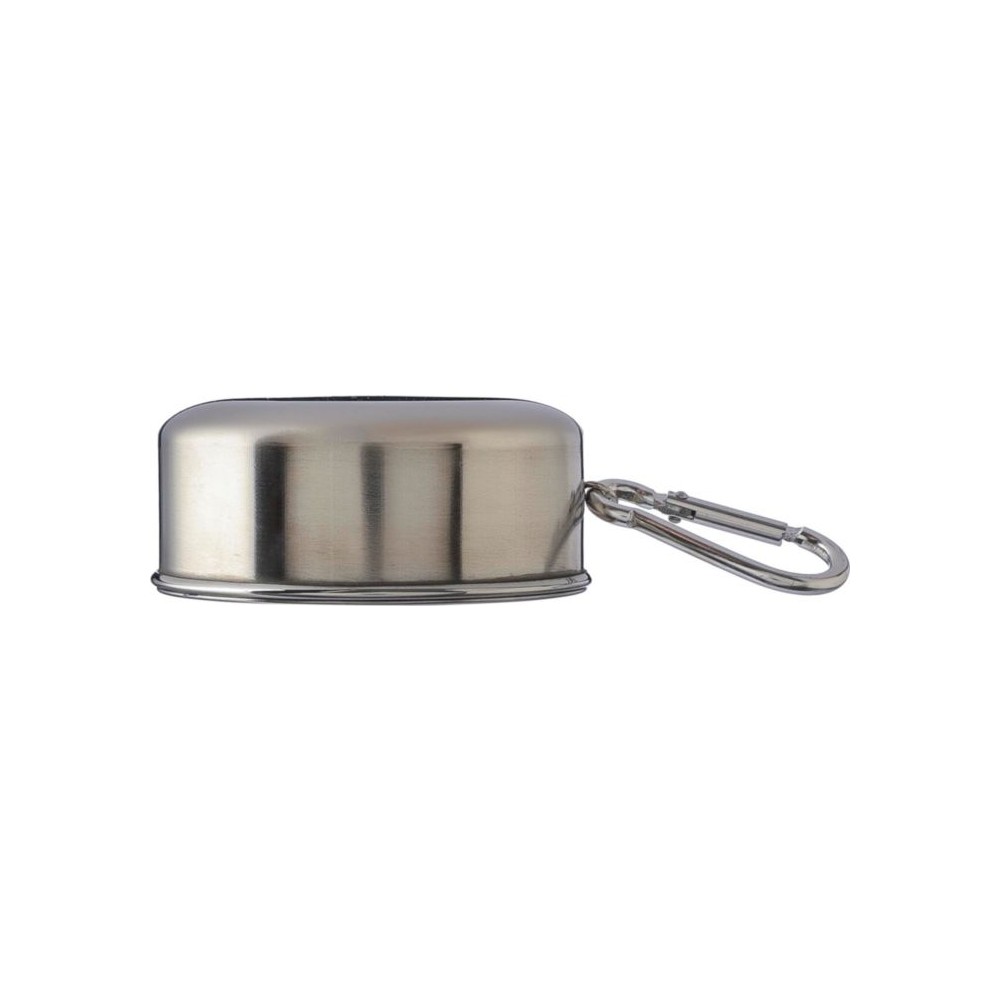 Összecsukható pohár fém karabinerrel. Egyenként barna kartondobozba csomagolva. Anyaga: rozsdamentes acél. Űrtartalom: 220 ml. Emblémázás: Gravírozás