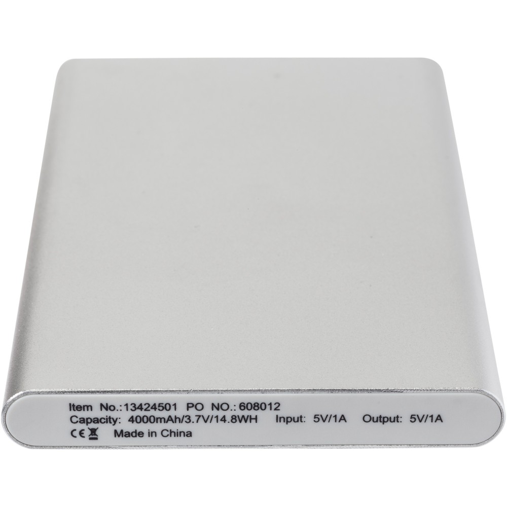 Pep powerbank 4000 mAh kapacitással, A lítium polimer akkumulátorral. Vékony, könnyű modell. A LED jelzőfény töltés közben jelzi a töltöttségi szintet, a kijelző pedig mutatja a maradék energiaszintet. Bemenet 5V/1A, kimenet 5V/1A. A USB / Micro-USB töltőkábelt tartalmazza. Csomagolása fehér doboz. Veszélyes áru, csomagban nem küldhető. Emblémázás: Gravírozás, Tamponnyomás, UV nyomtatás