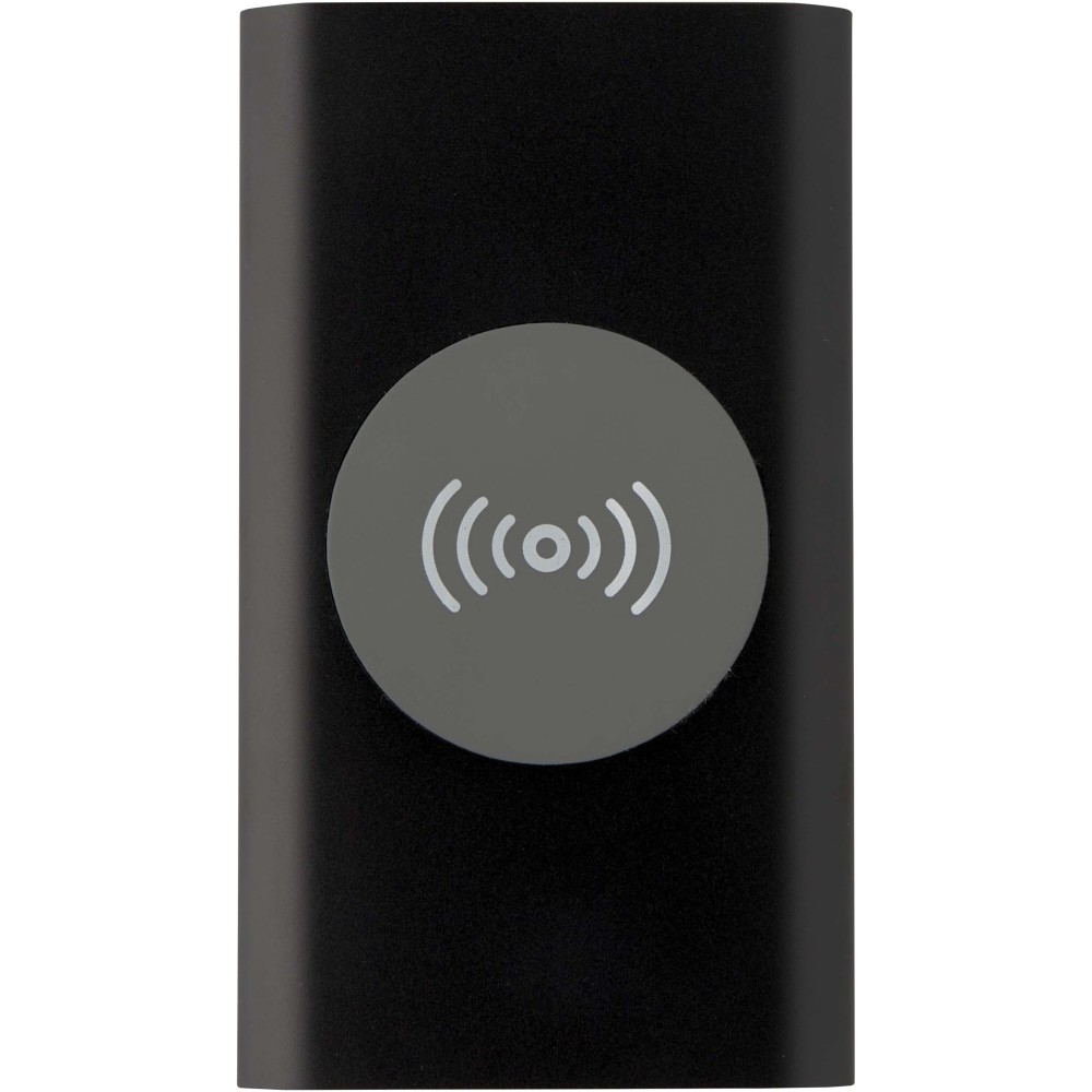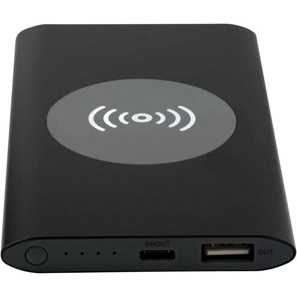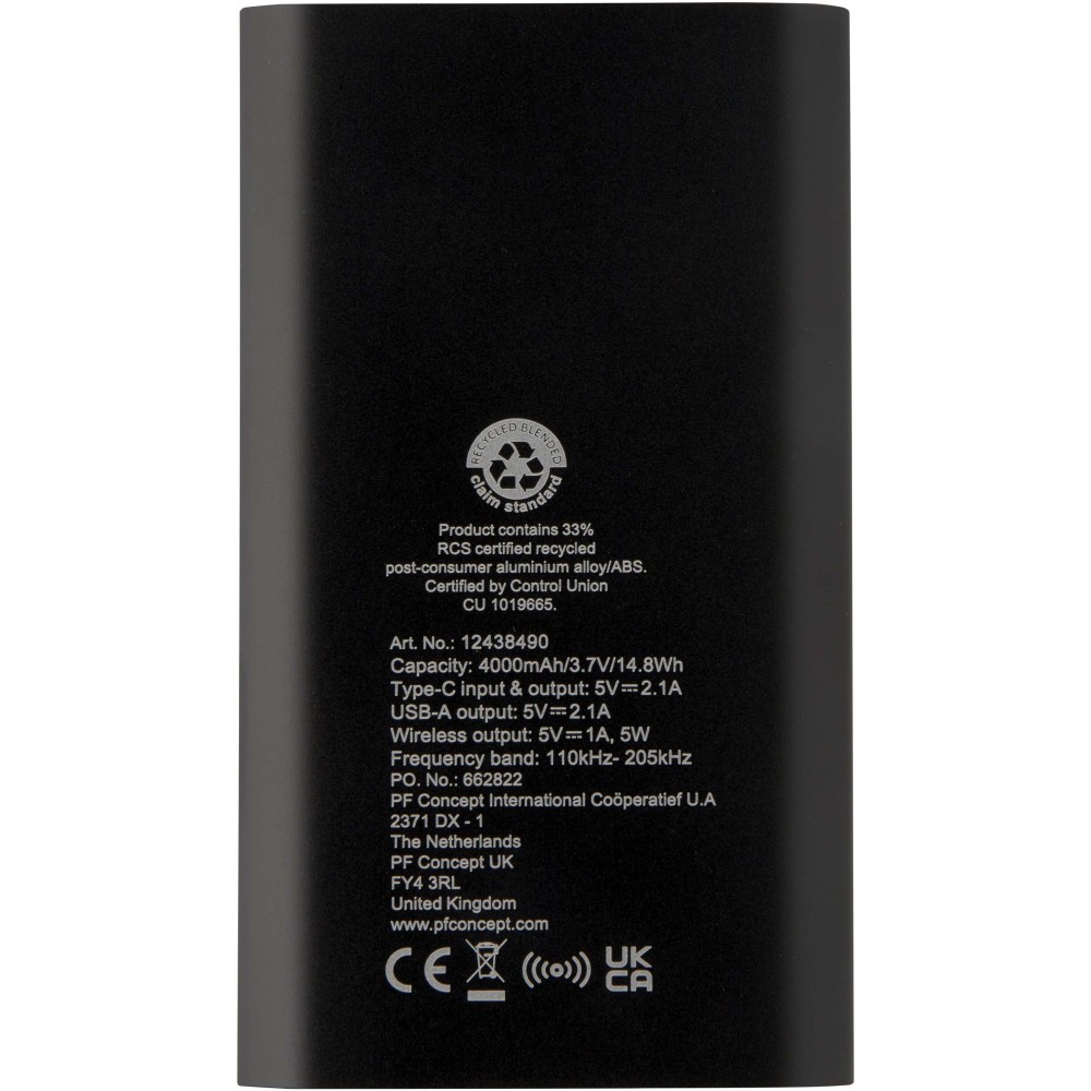 Powerbank Type-C bemeneti/kimeneti porttal és USB-A porttal, amely lehetővé teszi két eszköz egyidejű töltését. Támogatja az 5W vezeték nélküli töltést minden Qi-kompatibilis eszköz számára. A powerbank 4000 mAh kapacitású lítium-polimer akkumulátorral rendelkezik, amely max. 10W teljesítményt biztosít. A powerbank 28%-ban RCS tanúsítvánnyal rendelkező újrahasznosított műanyagból készült. TPE Type-C - USB-A töltőkábellel szállítjuk. Emblémázás: Gravírozás, Tamponnyomás