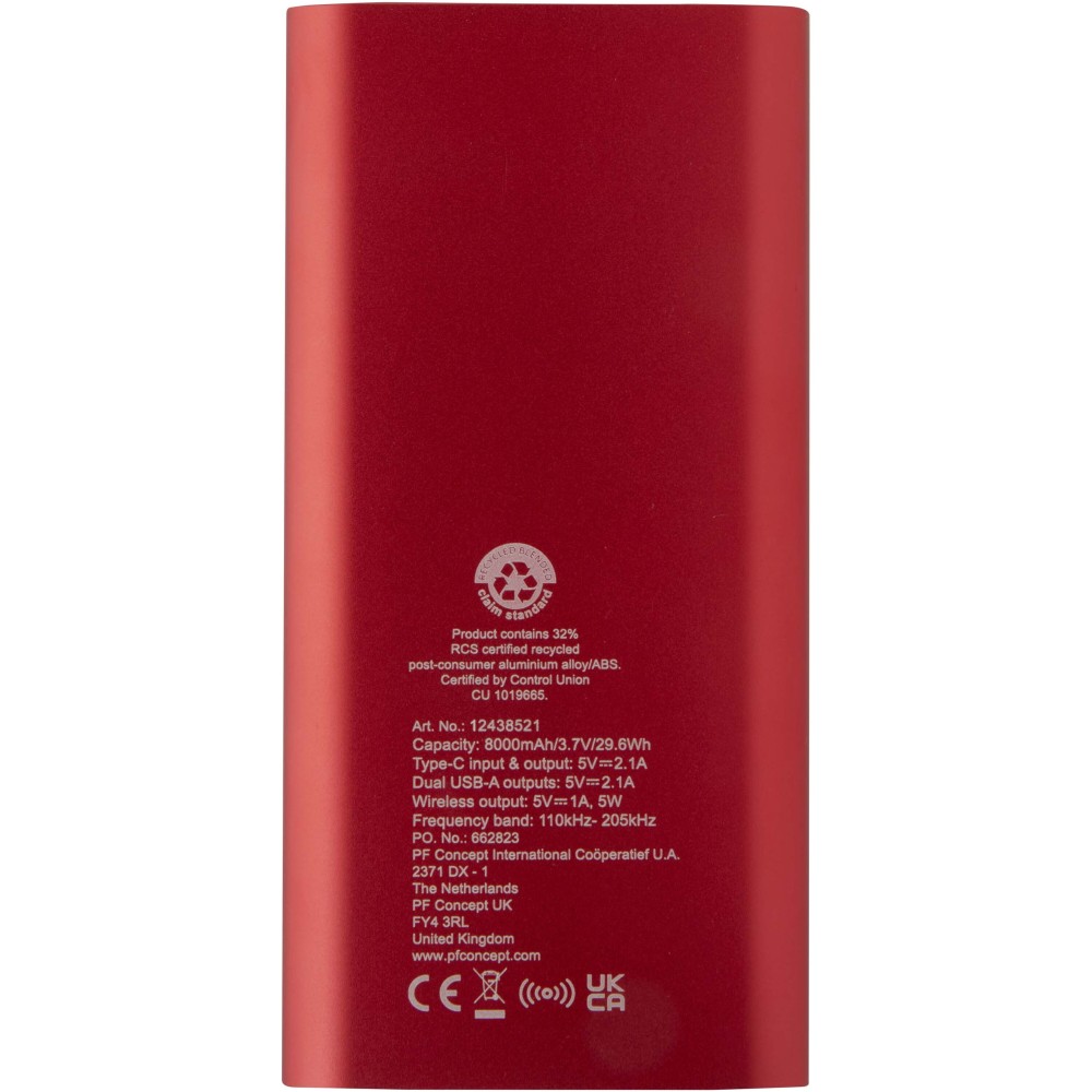 Powerbank Type-C bemeneti/kimeneti porttal és 2 db USB-A porttal, amelyek lehetővé teszik három eszköz egyidejű töltését. Támogatja az 5W vezeték nélküli töltést minden Qi-kompatibilis eszköz számára. A powerbank 8000 mAh kapacitású lítium-polimer akkumulátorral rendelkezik, amely max. 10W teljesítményt biztosít. A powerbank 28%-ban RCS tanúsítvánnyal rendelkező újrahasznosított műanyagból készült. TPE Type-C - USB-A töltőkábellel szállítjuk. Emblémázás: Gravírozás, Tamponnyomás, UV nyomtatás