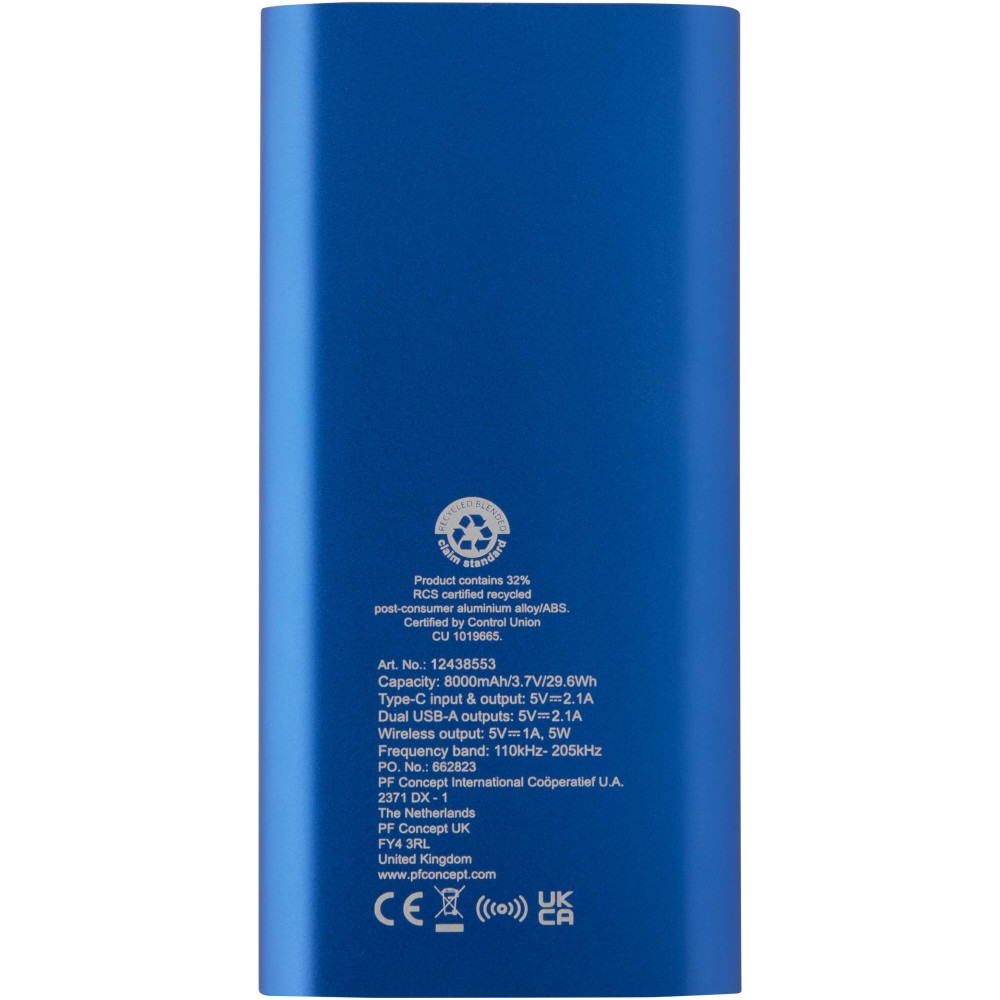 Powerbank Type-C bemeneti/kimeneti porttal és 2 db USB-A porttal, amelyek lehetővé teszik három eszköz egyidejű töltését. Támogatja az 5W vezeték nélküli töltést minden Qi-kompatibilis eszköz számára. A powerbank 8000 mAh kapacitású lítium-polimer akkumulátorral rendelkezik, amely max. 10W teljesítményt biztosít. A powerbank 28%-ban RCS tanúsítvánnyal rendelkező újrahasznosított műanyagból készült. TPE Type-C - USB-A töltőkábellel szállítjuk. Emblémázás: Gravírozás, Tamponnyomás, UV nyomtatás