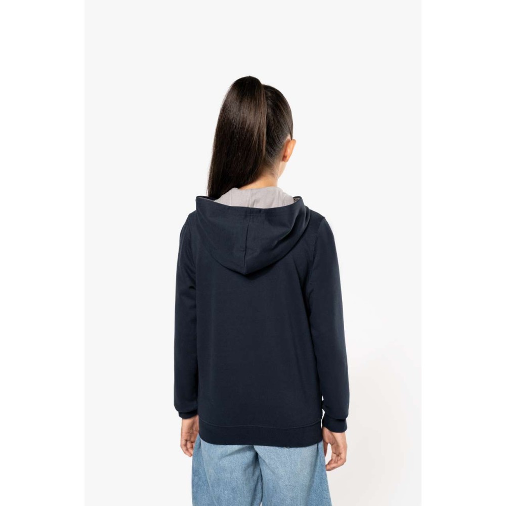 80% pamut és 20% poliészter anyag. Sima polár anyag, bordés ujj- és aljpasszé. Kontrasztos színű, bélelt kapucni.Fülhallgató számára kivezető nyílás a kanguru zsebből és a nyaknál. 280 g/m2. 6/8-12/14 éves méretig. Emblémázás: Hímzés, Szitanyomás