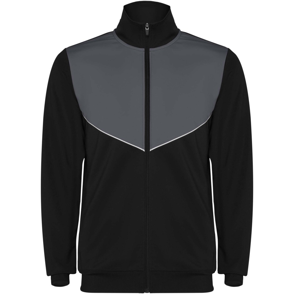 Könnyű és rugalmas anyagból készült melegítő. A végig cipzáros felső kontrasztos színű és varrású díszítésekkel dekorált a mellrészen. Oldalzsebek. Bordázott ujj- és és derékpasszé. Nadrág gumis derékkal és húzózsinórral, kontrasztos oldalsó varrással. Cipzáras szegély. Emblémázás: Hímzés, Szitanyomás