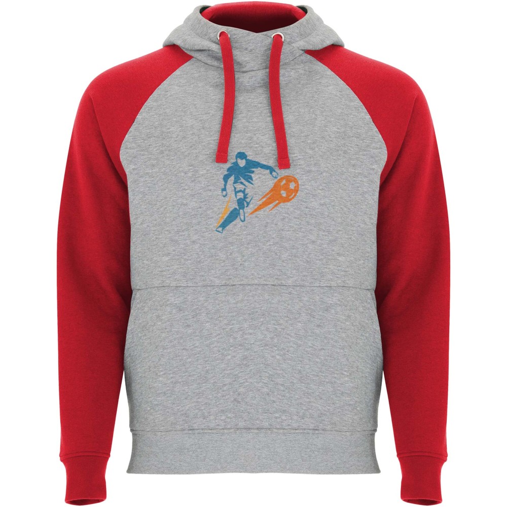 Két színű uniszex kapucnis pulóver. Kapucni keresztezett nyakrésszel és fém kiegészítőkkel. Kontrasztos belső rész a kapucnin, húzózsinór és raglán ujjak. Kenguru zseb. Rugalmas 1x1 passzék és alj. Levehető címke. Emblémázás: Hímzés, Szitanyomás