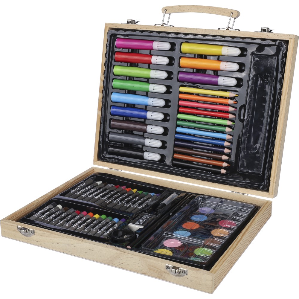 66 db-os rajzkészlet fa tartóban, fa fogantyúval. Tartalma: 12 db zsírkréta, 12 db színes filctoll, 12 db kihegyezett színes ceruza, 12 db olajpasztell kréta, 12 db festék, ragasztóstift, radír, ceruzahegyező, vonalzó, ecset és festőpaletta. Csomagolása barna papírdoboz. Emblémázás: Gravírozás, Tamponnyomás
