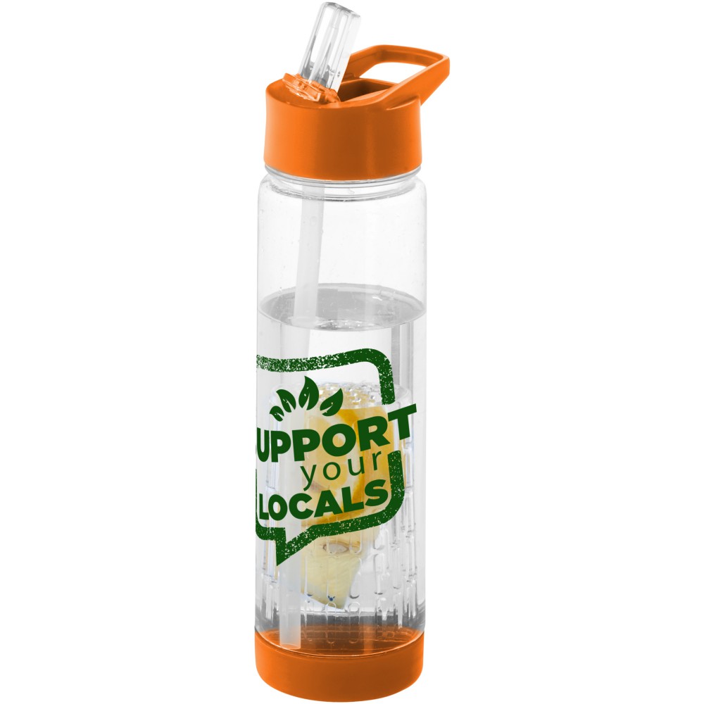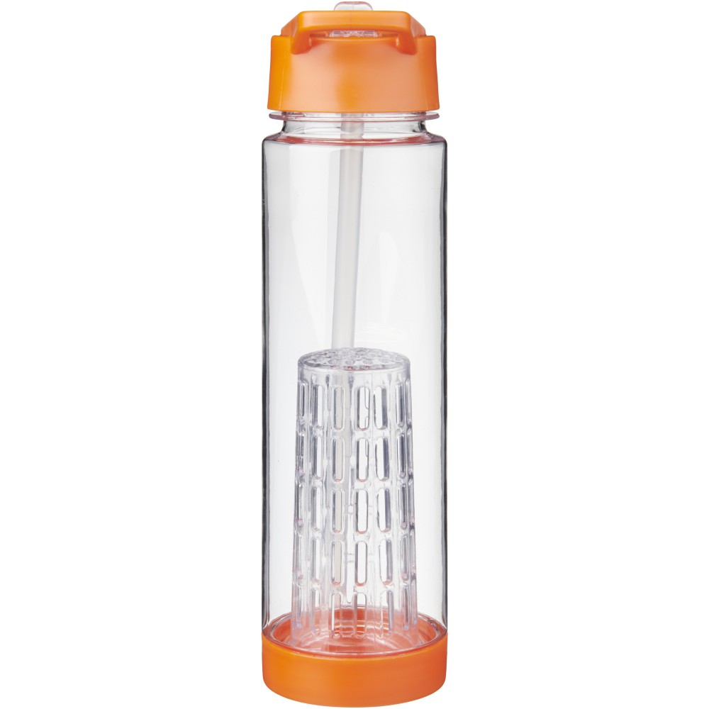 Tutti Frutti palack szűrőbetéttel, csavaros kupakkal, felpattintható ivócsővel. A szűrőbetétnek köszönhetően italunkba könnyen szűrhető módon tehetünk gyümölcsöt, zöldfűszert, zöldséget: mentát, citromfüvet, uborkát, levendulát, stb. A palack Eastman Tritan anyagból készült, így BPA-mentes, könnyű, tartós, szagmentes és ütésálló. Nem szivárgásmentes. Szénsavas italokkal nem használható. Mosogatógépben nem mosható és mikrohullámú sütőben történő melegítésre nem alkalmas. Űrtartalom: 740 ml. Emblémázás: Körszita, Tamponnyomás, UV nyomtatás