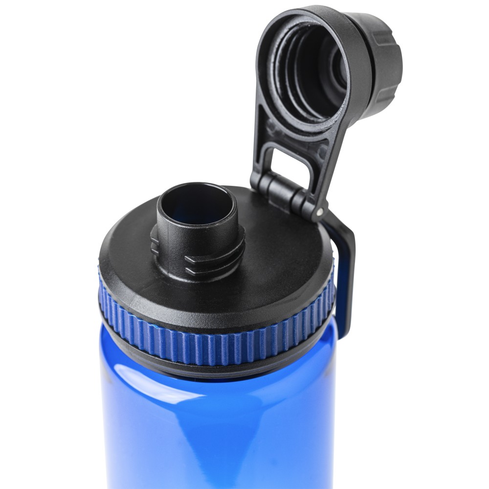 RPET anyagból készült ivópalack PP kupakkal, amely hordozófüllel és csavaros záródással rendelkezik, valamint a palack áttetsző testének színével harmonizáló szilikon díszítéssel. Űrtartalma 750 ml.