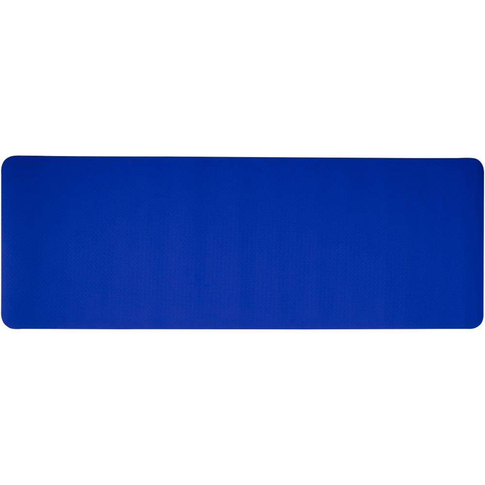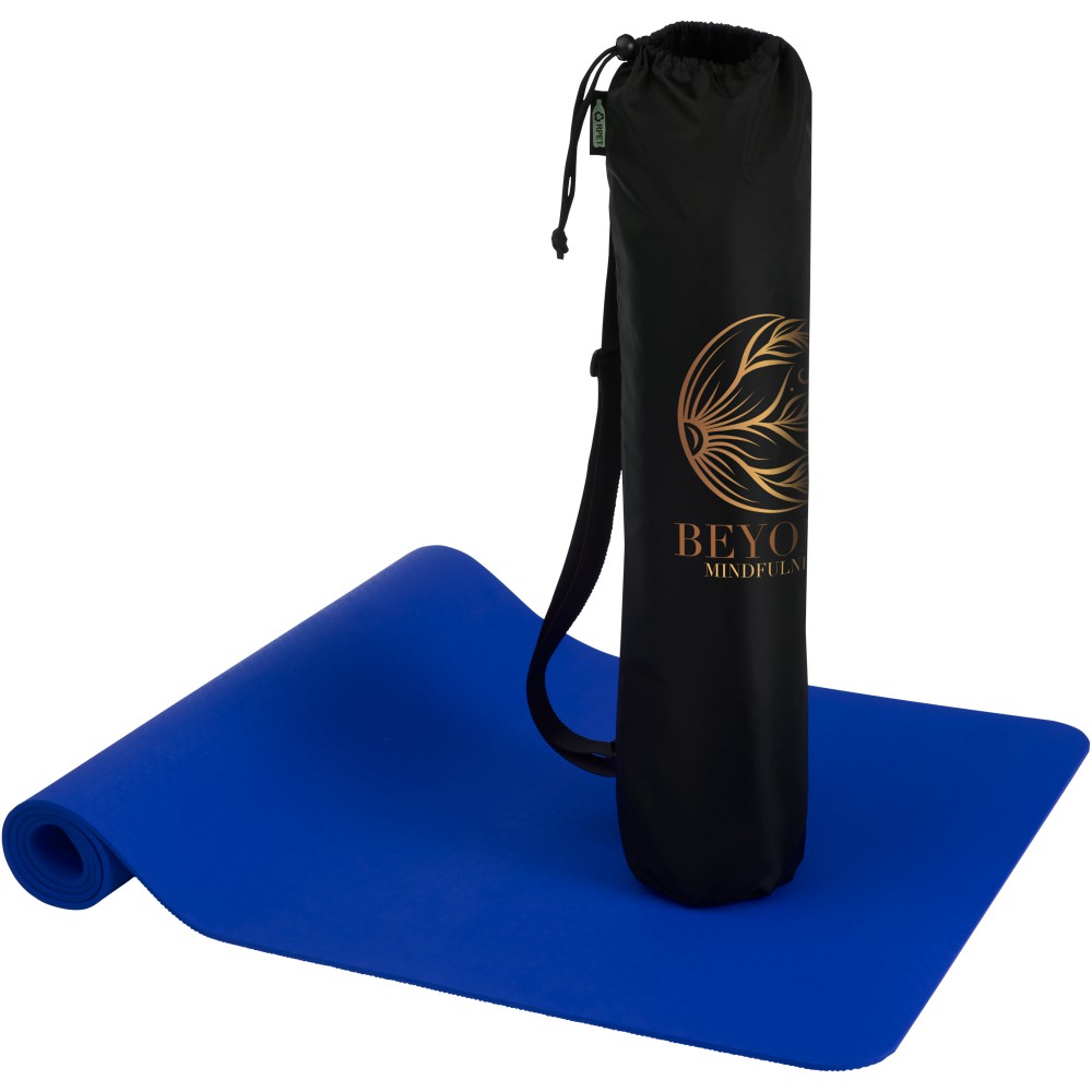 Újrahasznosított TPE műanyagból készült jógaszőnyeg. A TPE természetes csúszásgátló tulajdonságokkal rendelkezik, így stabil felületet biztosít, amely segít megelőzni a csúszást a jógapózok során. Az újrahasznosított TPE felhasználása a jógaszőnyegek gyártása során segít csökkenteni a hulladékok mennyiségét, és elősegíti a környezet fenntarthatóságát azáltal, hogy minimalizálja az új műanyagok használatát. Mérete: 173 x 61 x 0,6 cm. A tasak RPET anyagból készült. Emblémázás: Szitanyomás