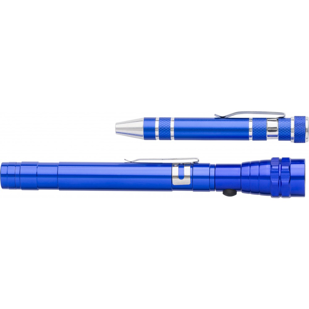 Teleszkópos elemlámpa 3 LED fénnyel és egy toll formájú csavarhúzószett 3 db laposfejű csavarhúzóval és 4 db Phillips csavarfejjel. Csomagolás fekete ajándékdobozban. Emblémázás: Gravírozás, Tamponnyomás