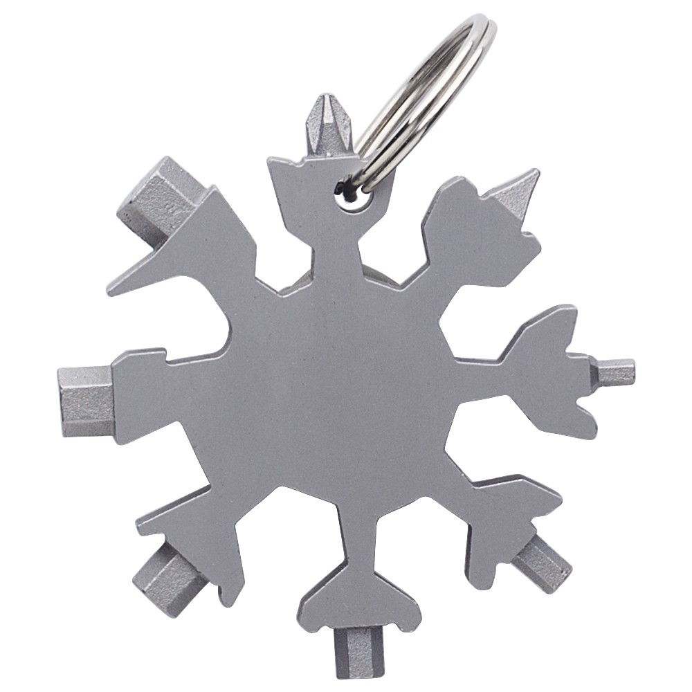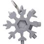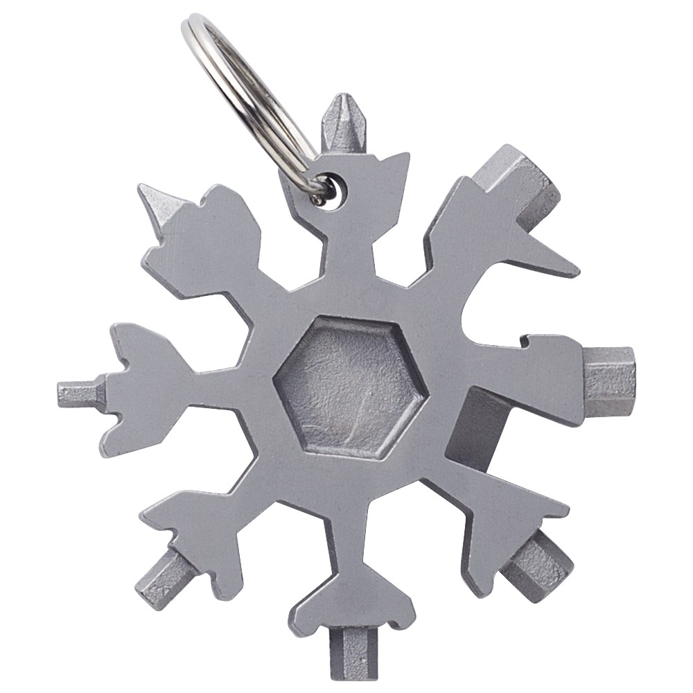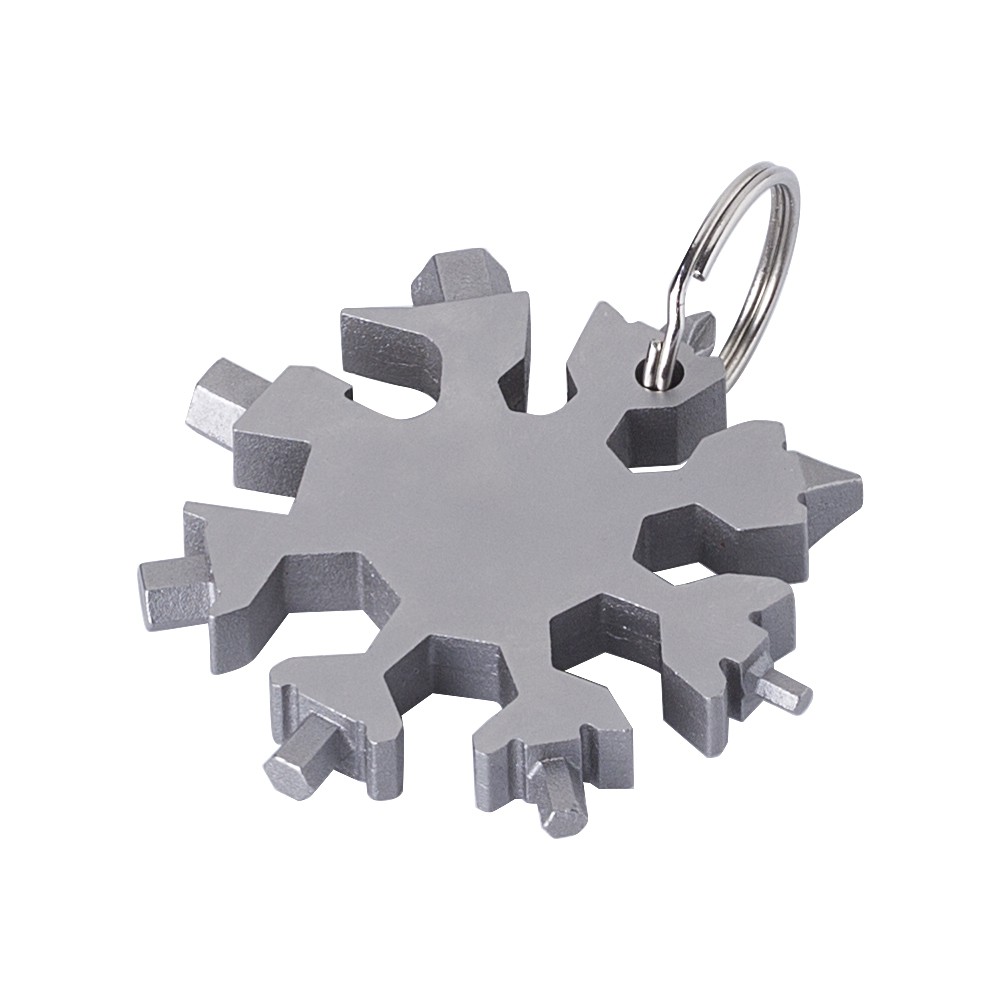 17-in-1 fém szerszámkészlet hópihe formában, kulcstartóval. Csomagolása barna papírdoboz. Emblémázás: Gravírozás