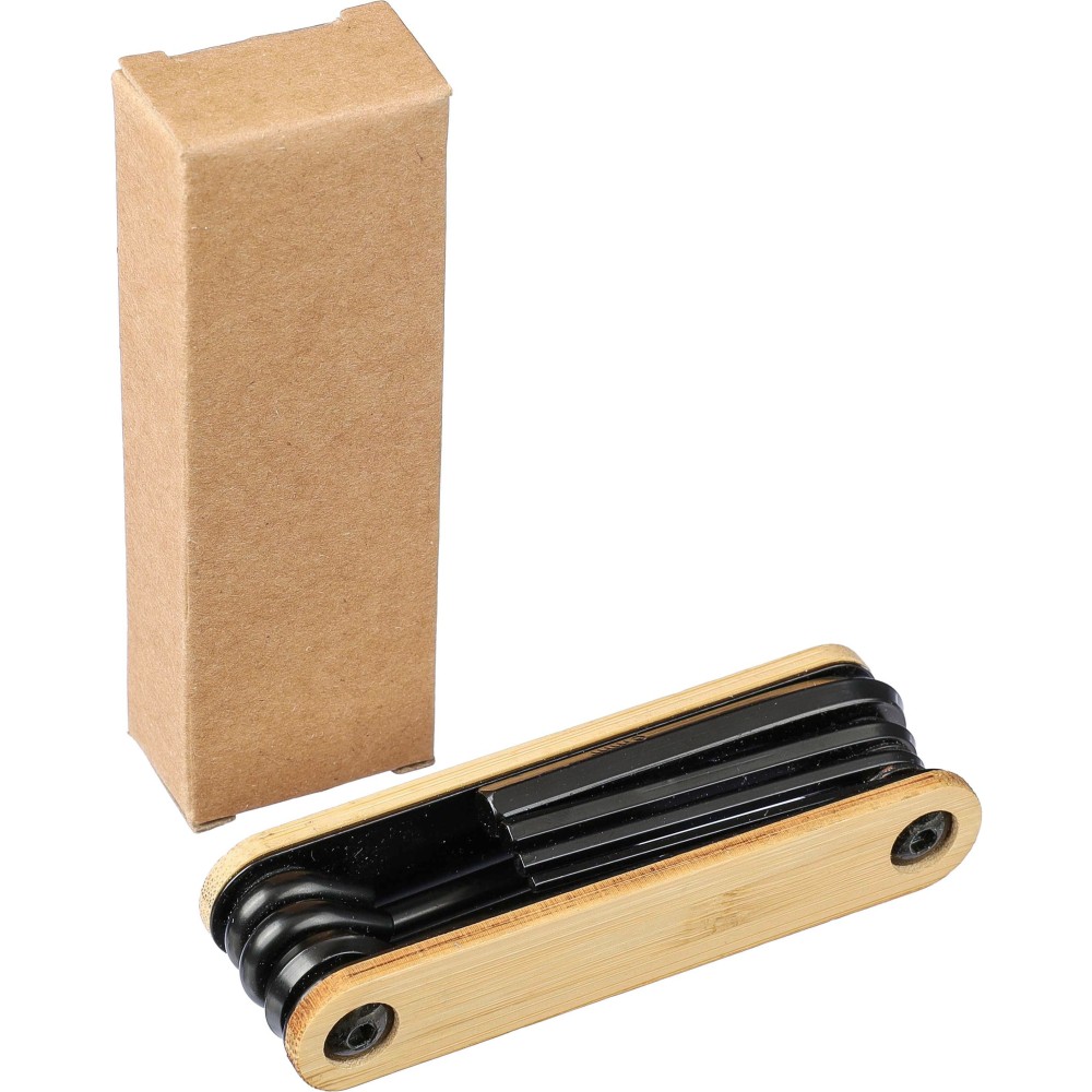 Szerszámkészlet bambusz részletekkel. 7 eszközt tartalmaz: imbuszkulcsok, Phillips csavarhúzó és laposfejű csavarhúzó. Egyenként barna kartondobozba csomagolva. Anyaga: szénacél. Emblémázás: Tamponnyomás