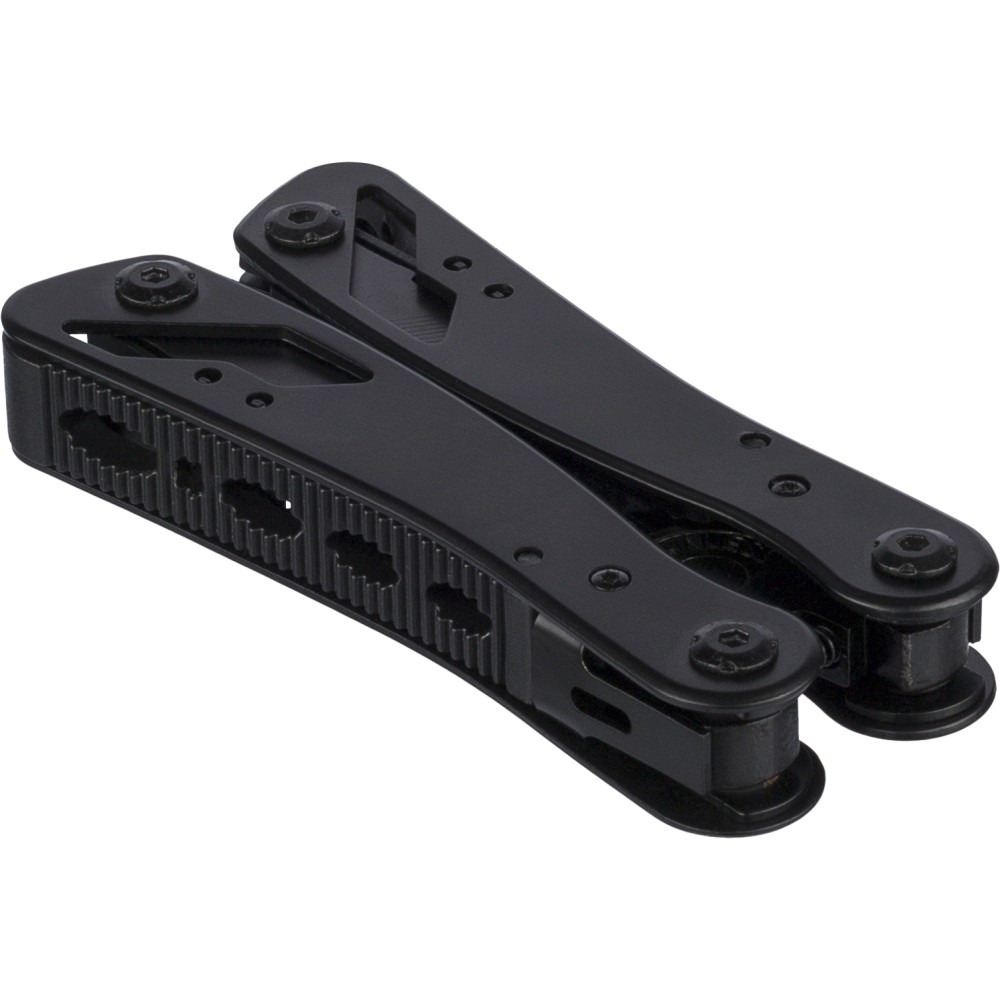Fekete alumíniumból és rozsdamentes acélból készült multifunkciós szerszám 13 funkcióval, beleértve a késeket, csavarhúzókat, fogót, fűrészt, reszelőt, emelőkart, biteket, rugót, rögzítőrudat, konzervnyitót és támasztékot. Tokkal szállítva, amely tépőzáras övbújtatóval rendelkezik, valamint további külső dobozzal. Darabonként barna kartondobozba csomagolva.