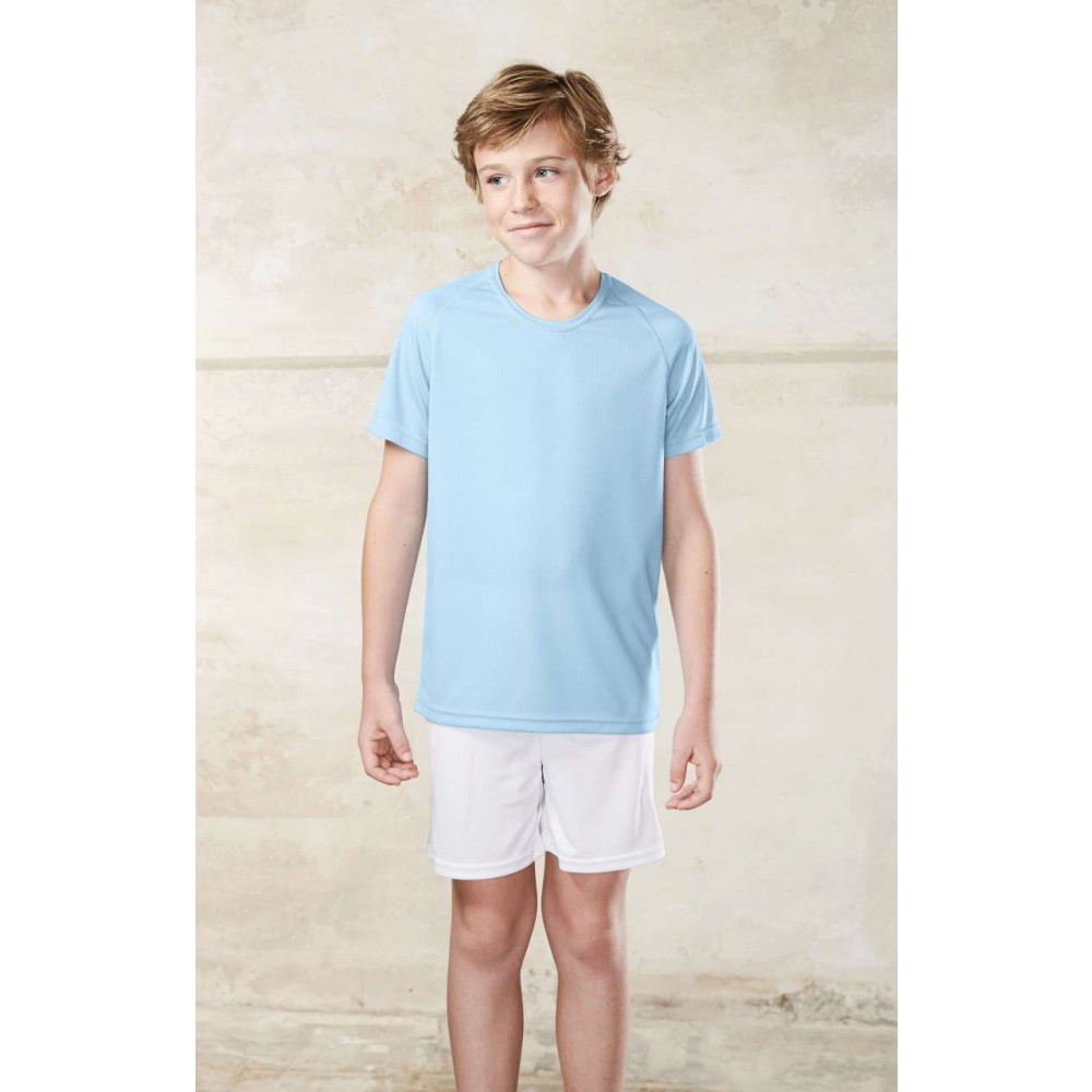 100% poliészter. Gyorsan száradó, könnyű anyag. Szalagerősített nyakvonal, raglán ujjak, duplatűzött szegések. 140 g/m2. 6/8 évestől 12/14 éves méretig. Emblémázás: Szitanyomás