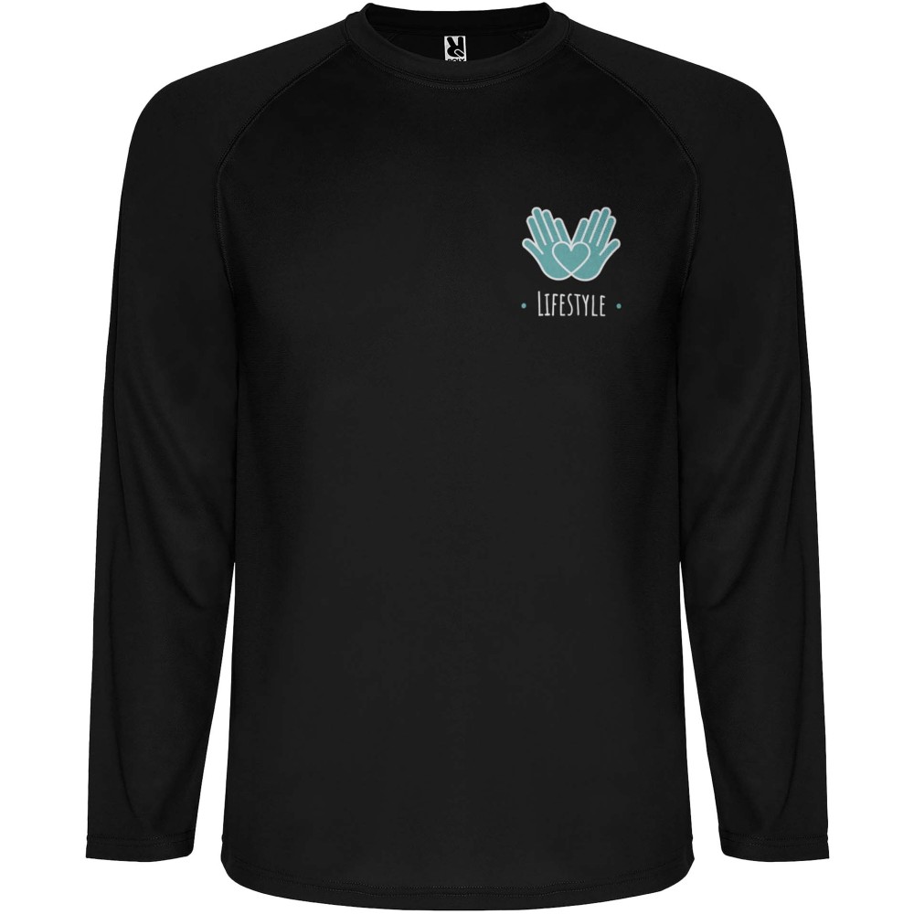 Hosszúujjú technikai raglánujjú póló. Illeszkedő overlock varrások az ujjakon (oldalsó varratok nélkül). Fedett varrások a nyaknál. Lélegző, könnyen mosható és gyorsan száradó anyag. Levehető címke. Emblémázás: Szitanyomás