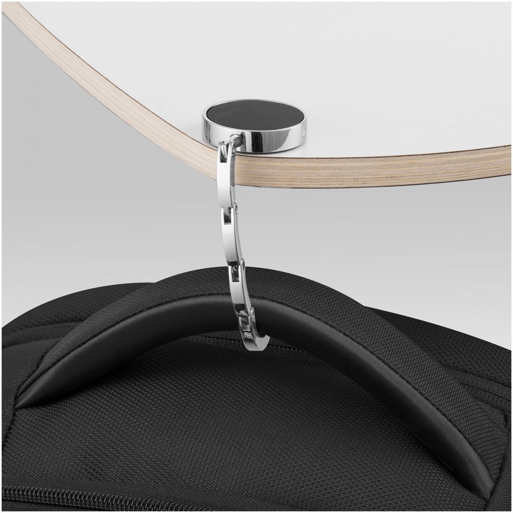 Összehajtható táskaakasztó, mellyel tisztán és biztonságban tarthatja táskáját. Az akasztót bármely felszín peremére felrögzítheti, max. 4,5 kg súlyt bír el. Fekete ajándékdobozban. Emblémázás: Tamponnyomás, UV nyomtatás