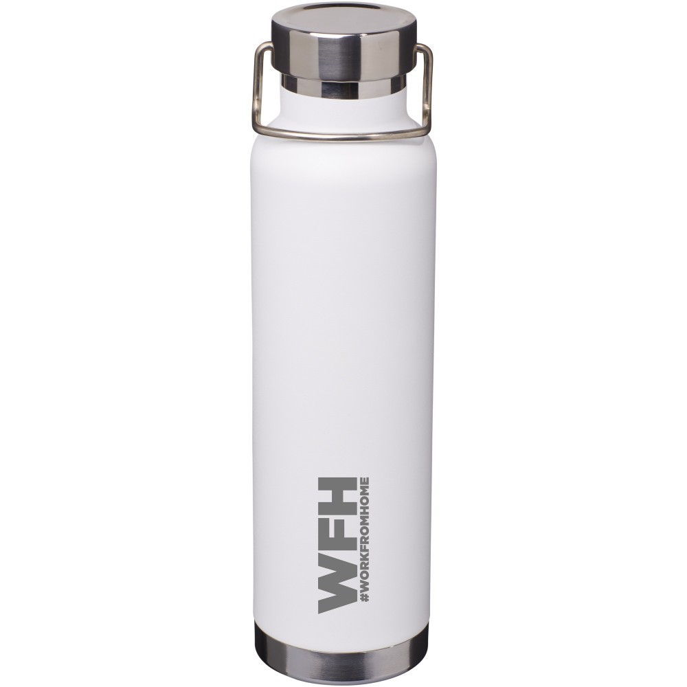 Thor duplafalú vákumos palack. Belső fala réz, ennek köszönhetően 48 órás hideg- és 12 órás melegtartási képességgel rendelkezik. Ez a kialakítás megakadályozza a kondenzációt a palack külső falán. A termoszhoz csavaros, rozsdamentes acél kupak tartozik. Széles kiöntő nyílással rendelkezik, amely akár jégkockák behelyezésére is alkalmas. Szivárgásmentes. Szénsavas italokkal nem használható. Mosogatógépben nem mosható és mikrohullámú sütőben történő melegítésre nem alkalmas. Űrtartalom: 650 ml. Csomagolása Avenue díszdoboz. Rozsdamentes acél. Emblémázás: Gravírozás, Tamponnyomás