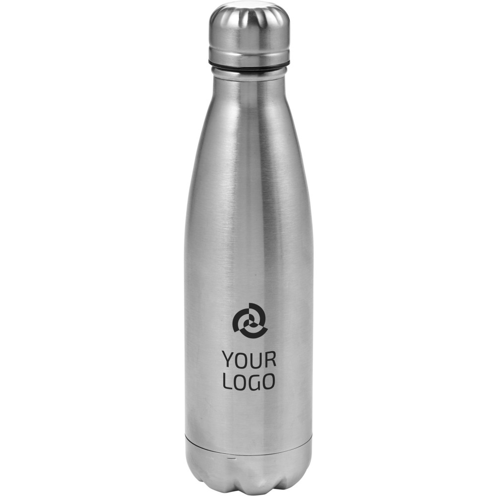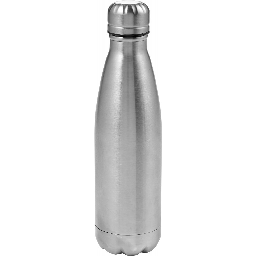 Duplafalú vizespalack csavaros kupakkal. Űrtartalom: 500 ml. Nem szivárgásmentes. Mosogatógépben nem tisztítható. Rozsdamentes acél. Emblémázás: Gravírozás, Körszita, Tamponnyomás