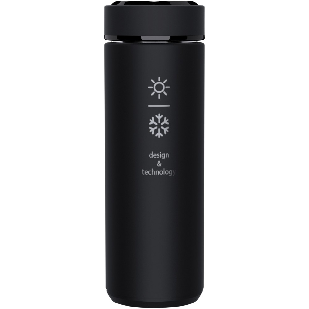 Duplafalú 500 ml-es szigetelt, rozsdamentes palack antibakteriális kezeléssel és hőmérséklet-érzékelővel. A Touch & Light rendszernek köszönhetően az ital hőmérséklete megjelenik a palack kupakján (Celsius fokban). Meleg és hideg italokhoz egyaránt alkalmas. Újrahasznosított papírból készült, hengeres díszdobozban szállítjuk. Mérete: d: 47 x 225 mm. Elem: CR 2450 (3V). Az akkumulátor nem cserélhető. 20 000-szer képes megjeleníteni a hőmérsékletet. Emblémázás: Gravírozás, Körszita