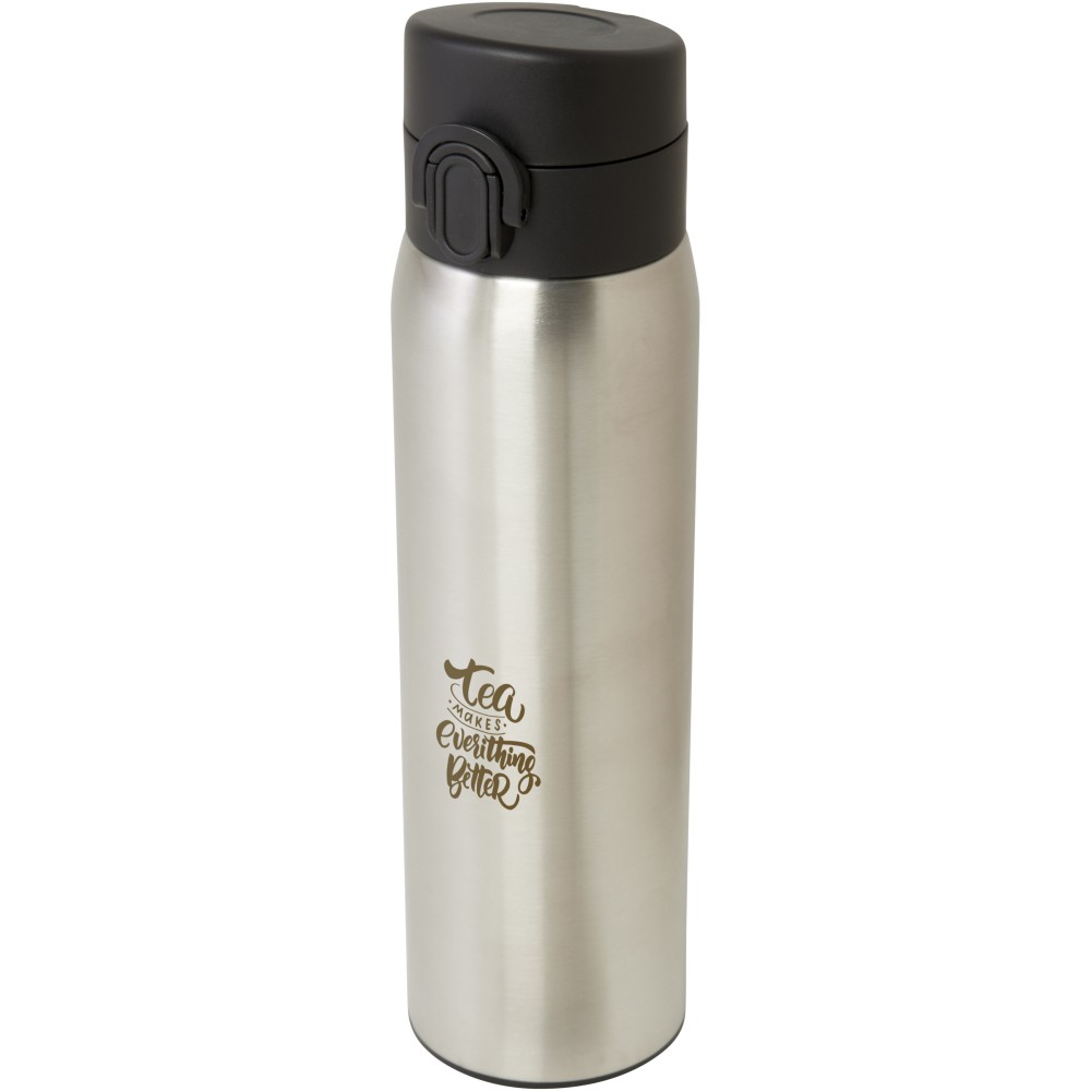 Stílusos, RCS tanúsítvánnyal rendelkező újrahasznosított rozsdamentes acélból készült, szigetelt palack gombos nyitómechanizmussal. A flaska szivárgásmentes és a réz vákuumszigetelésnek köszönhetően az italokat több órán keresztül forrón vagy hidegen tartja. Űrtartalom: 450 ml. Újrahasznosított kartonból készült díszdobozban szállítjuk. Emblémázás: Gravírozás