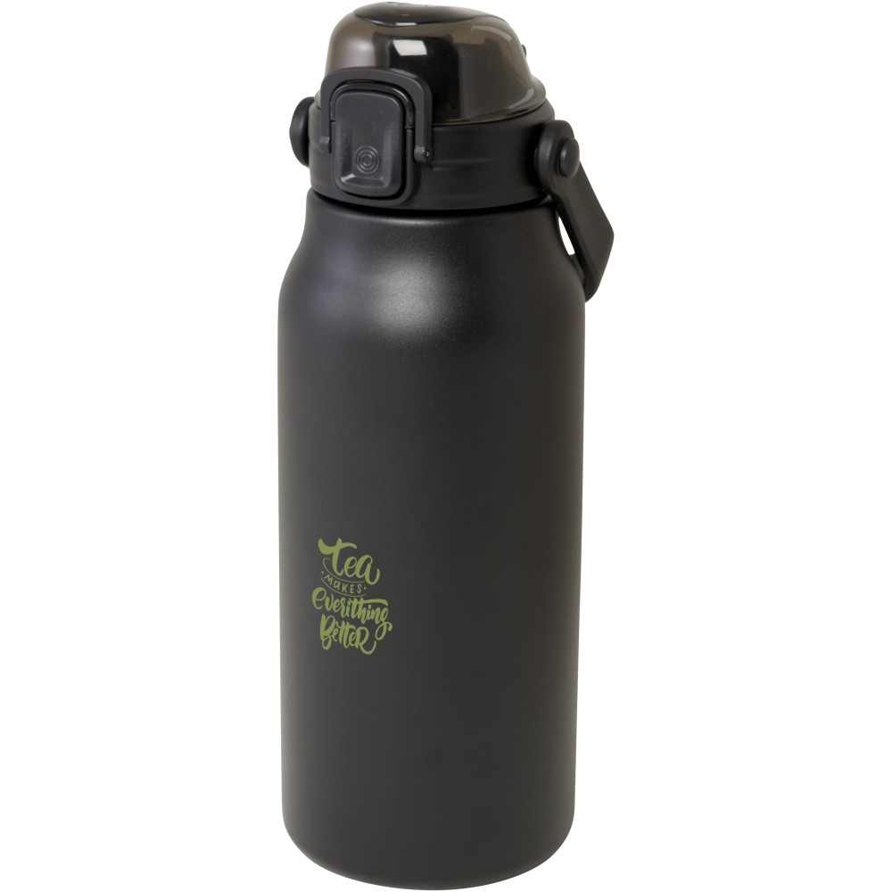 Ez a nagyméretű, RCS tanúsítvánnyal rendelkező, újrahasznosított rozsdamentes acél palack stílusosan hidratál egész nap. A réz vákuumszigetelés több órán át melegen vagy hidegen tartja az italokat, és az összecsukható fogantyúval könnyen hordozható. A palack szivárgásmentes, és gombos nyitómechanizmussal rendelkezik. Nagy űrtartalmú palack: 1600 ml. Újrahasznosított kartonból készült díszdobozban szállítjuk. Emblémázás: Gravírozás